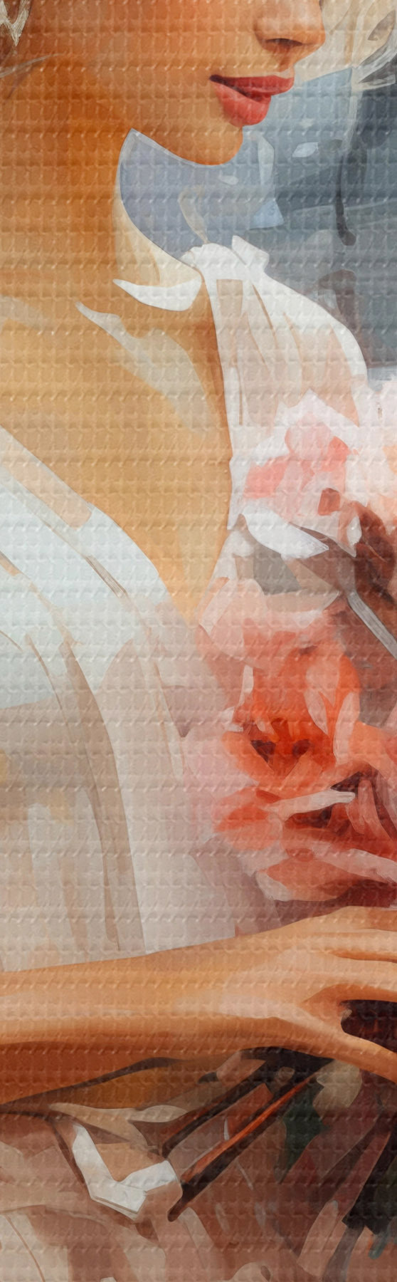 Pictură pe pânză O fată într-o rochie albă la gară deține un buchet de trandafiri roz în mâinile ei pictură în ulei Nr s39438