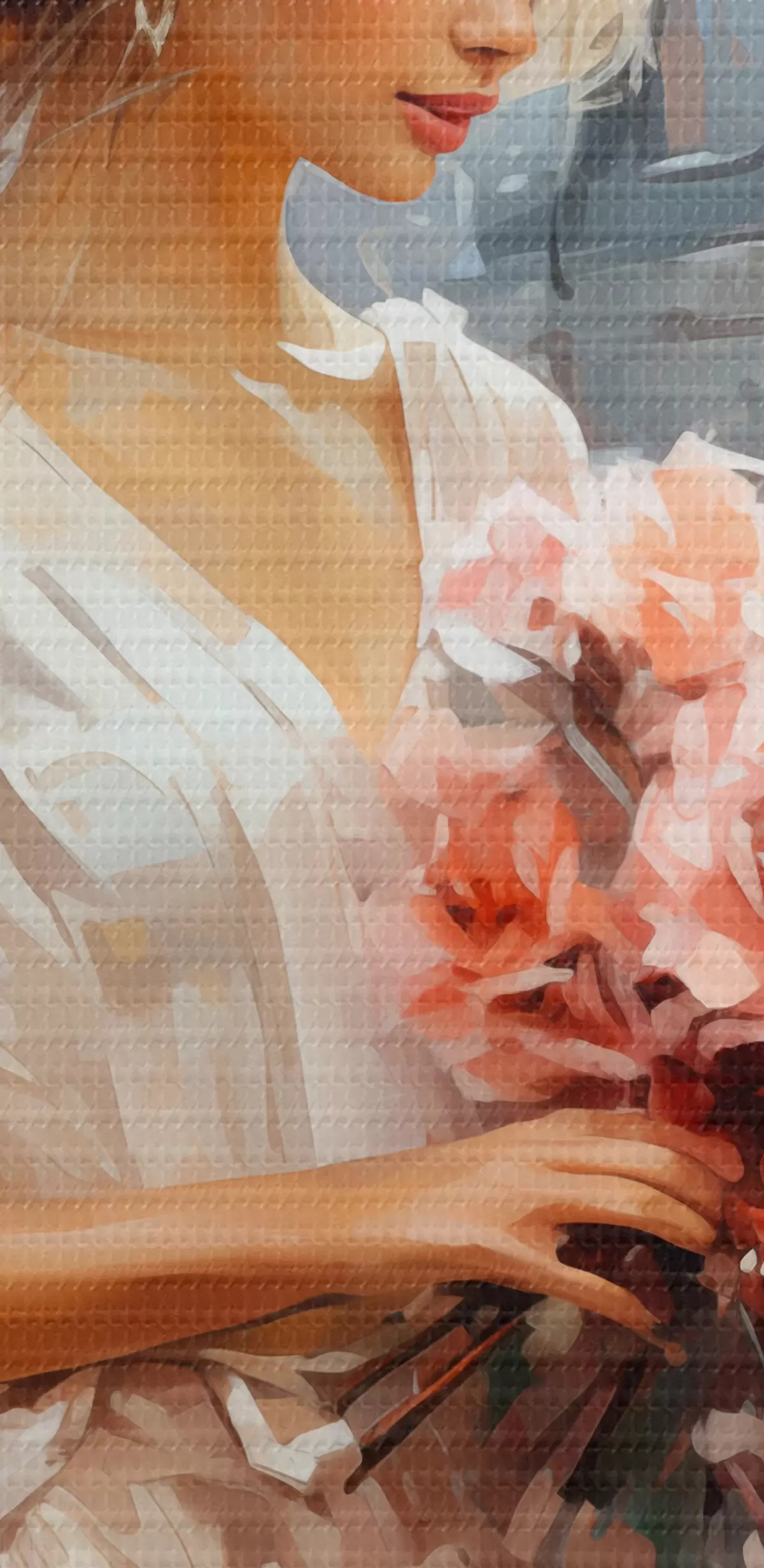 Pictură pe pânză O fată într-o rochie albă la gară deține un buchet de trandafiri roz în mâinile ei pictură în ulei Nr s39438