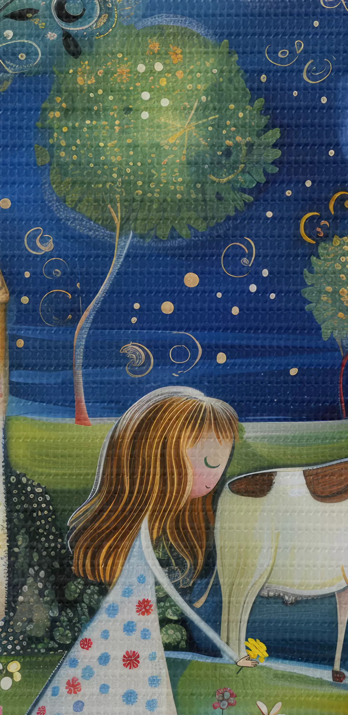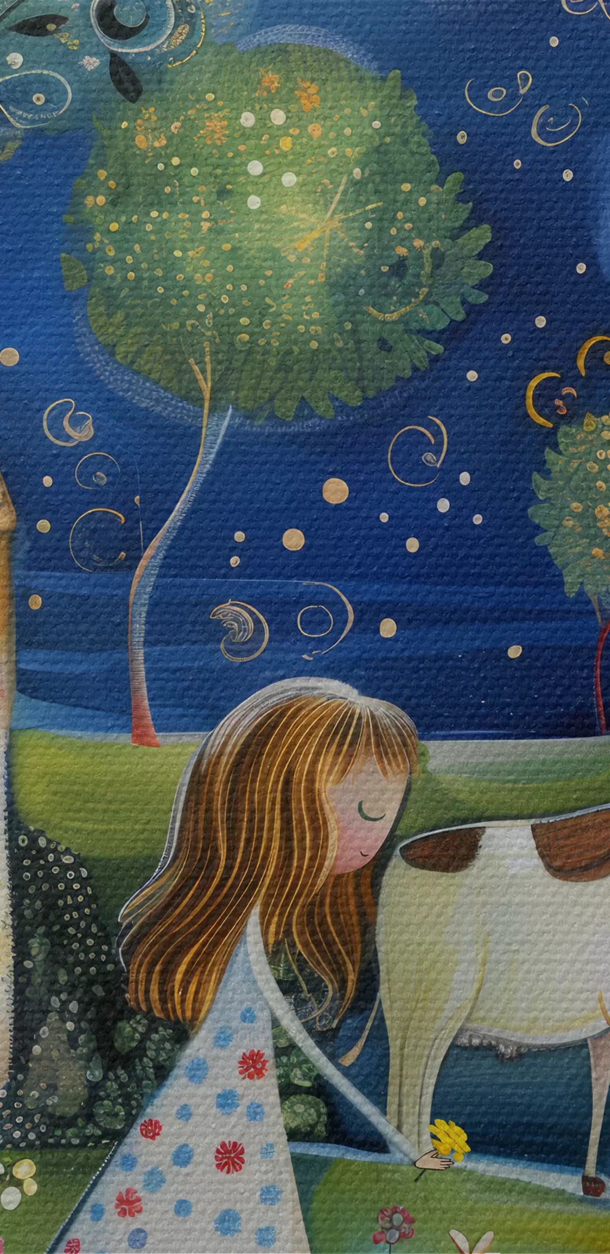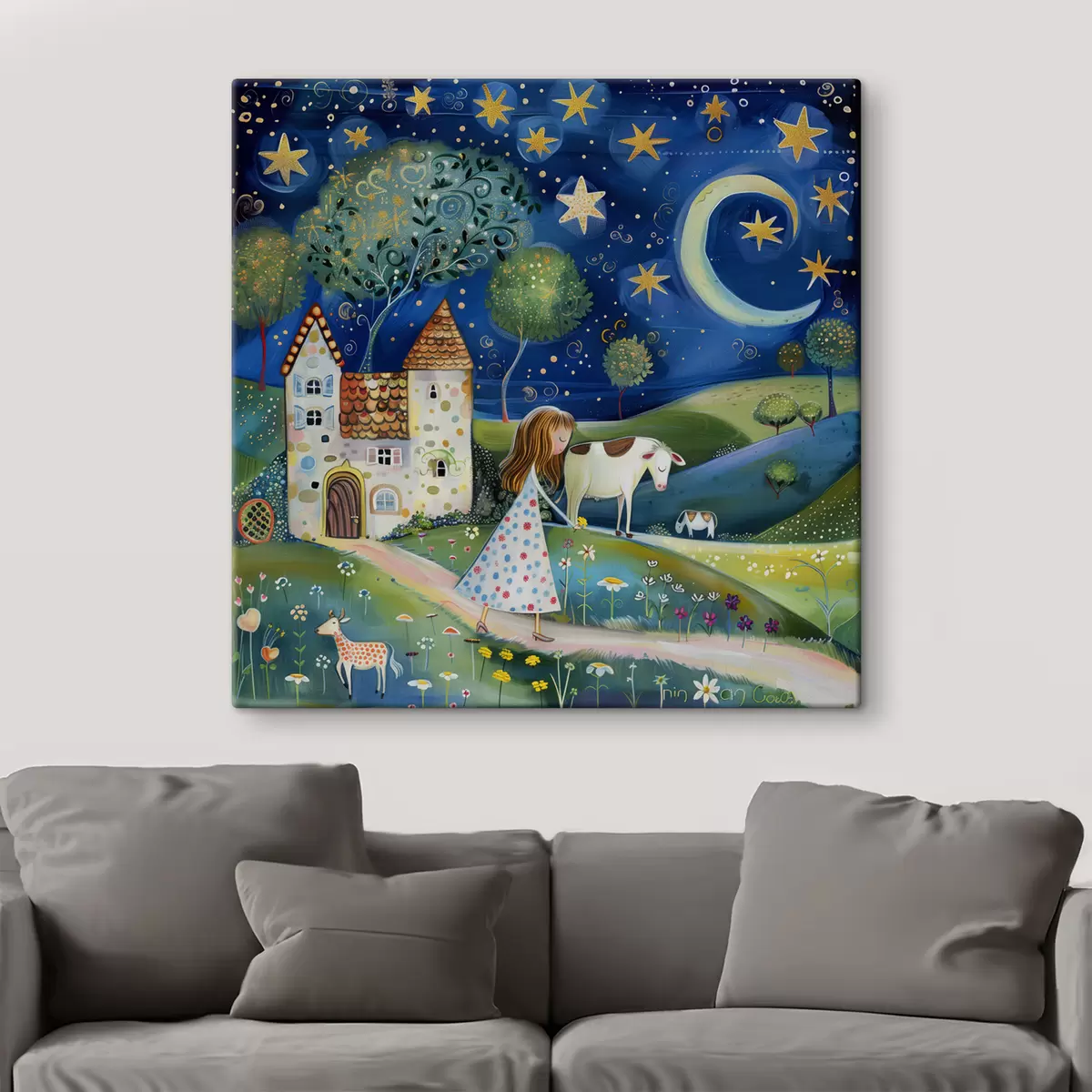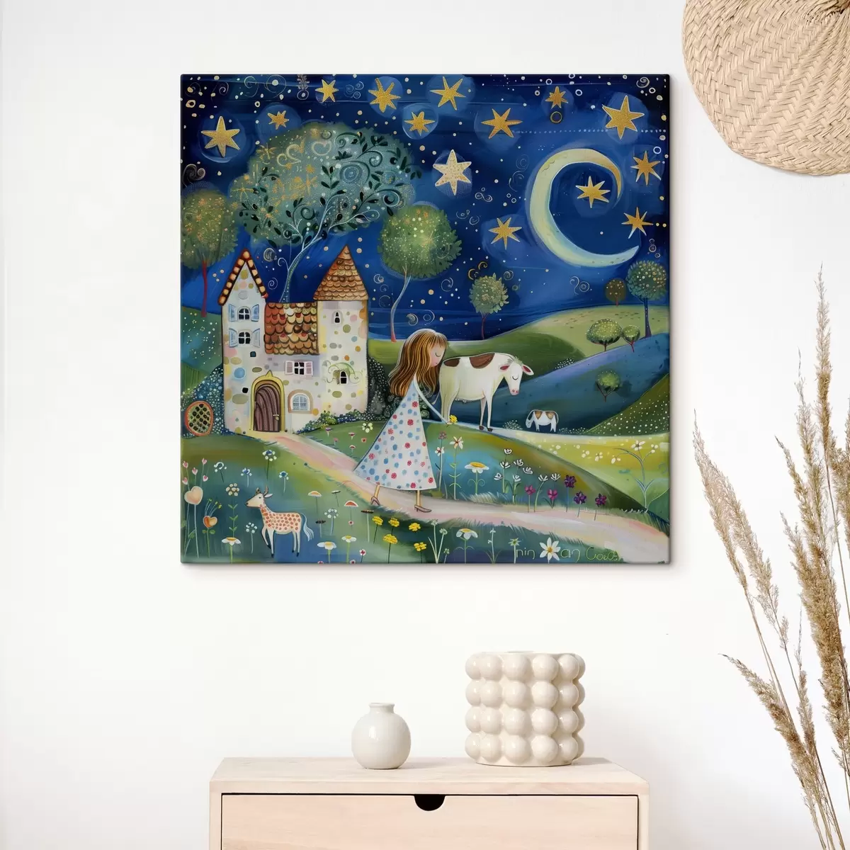 Pictură pe pânză O mică prințesă, un câine, o vacă și o casă fantastică sub stele, în stilul capricios al artei naive Nr s39451