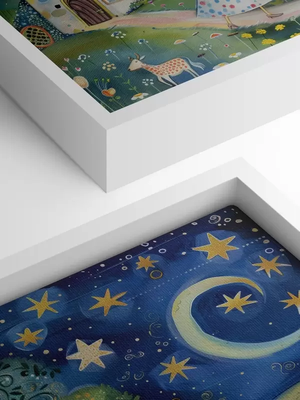 Tablouri O mică prințesă, un câine, o vacă și o casă fantastică sub stele, în stilul capricios al artei naive s39451