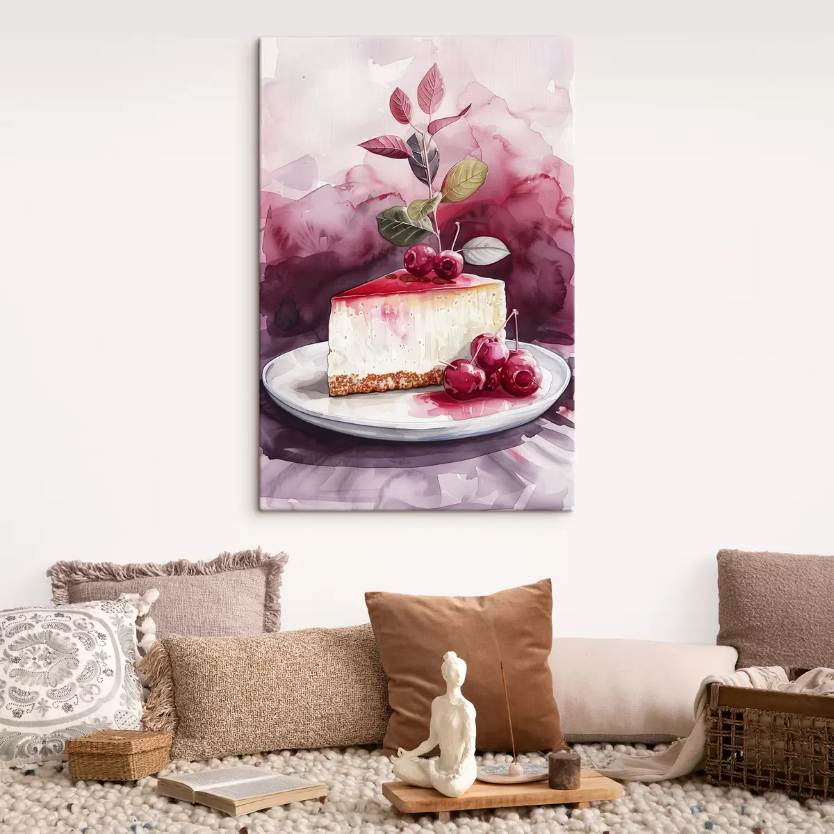 Pictură pe pânză Cheesecake acuarelă cu cireșe, artă alimentară elegantă, culori roșii și violet Nr s39700
