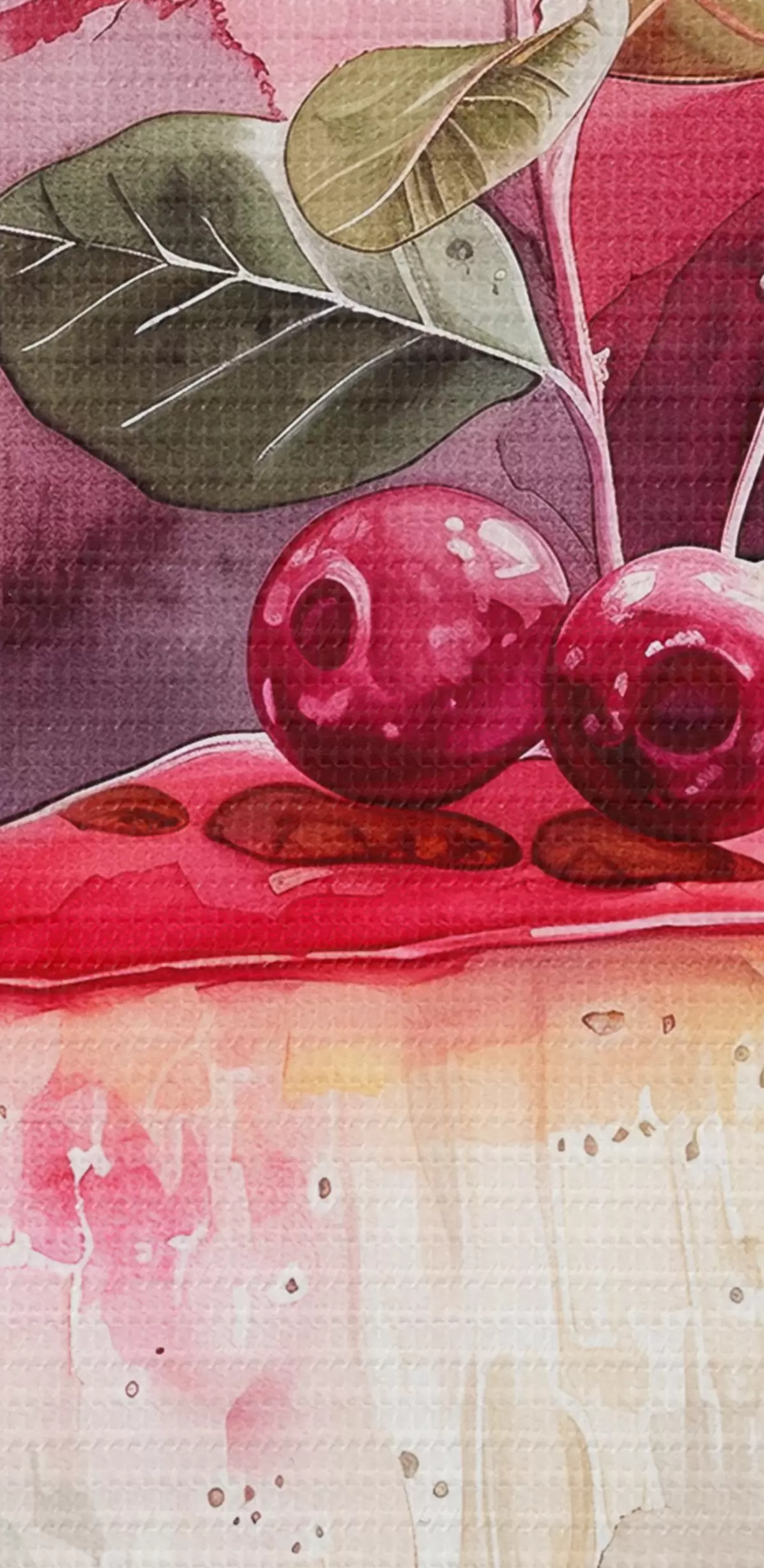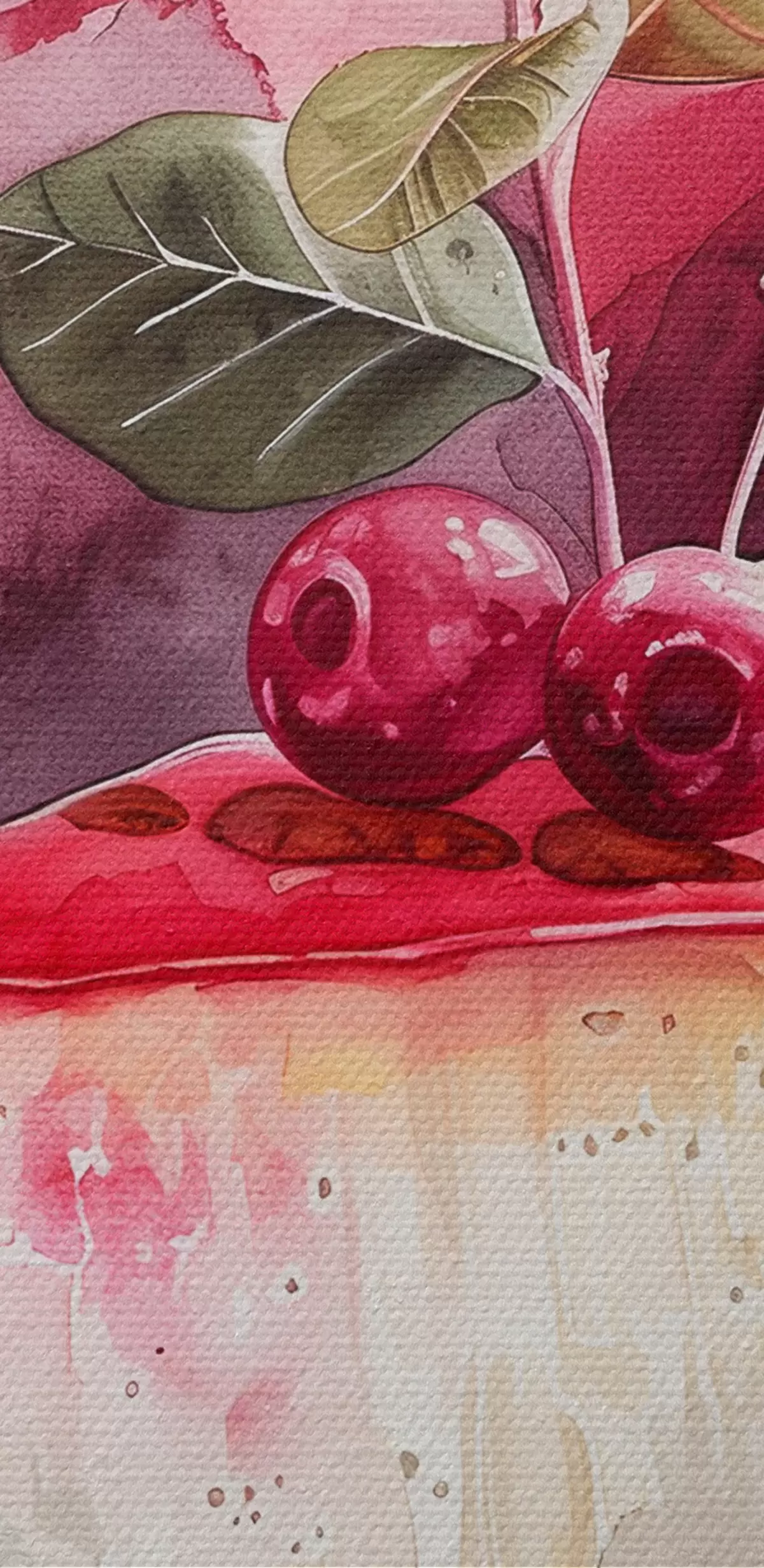 Tablouri Cheesecake acuarelă cu cireșe, artă alimentară elegantă, culori roșii și violet s39700