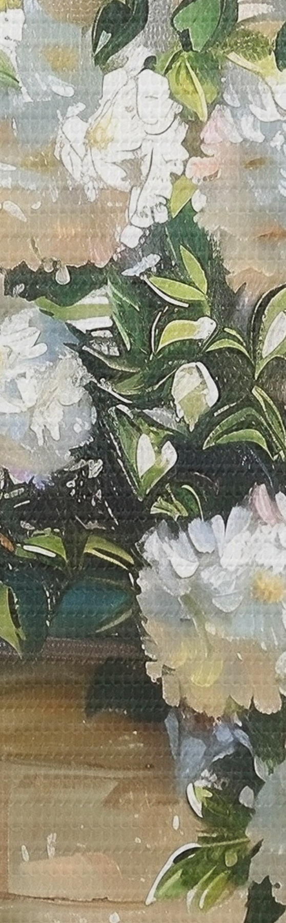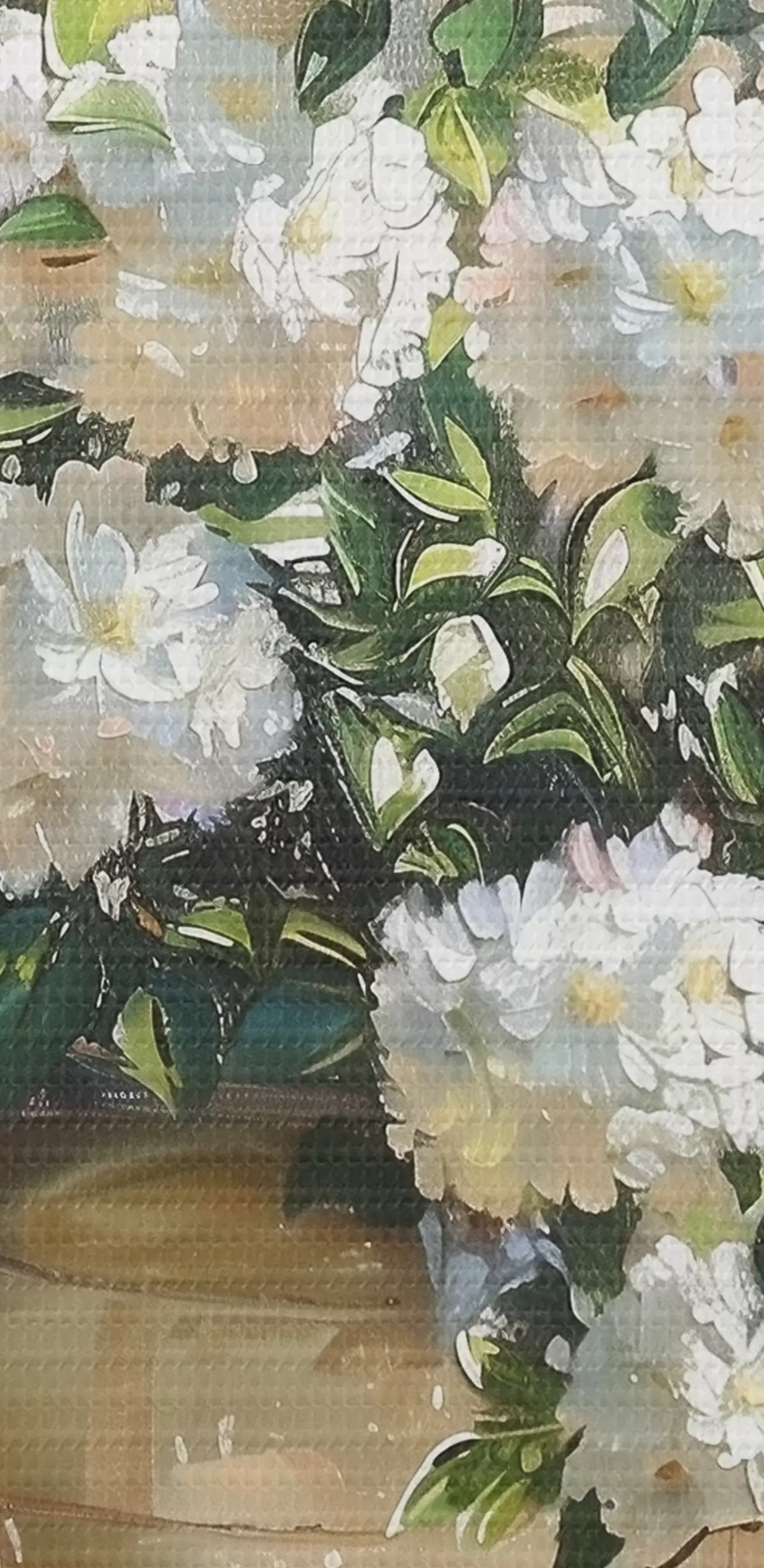Pictură pe pânză Hortensii albe în vază, lumina soarelui în fereastră, pictură în ulei Nr s39779