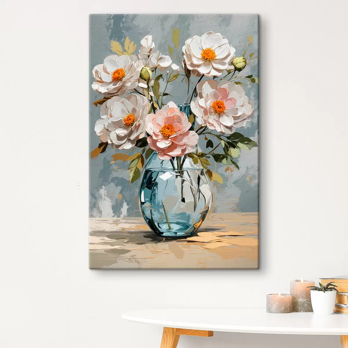 Pictură pe pânză Flori albe în vază transparentă Nr s39850
