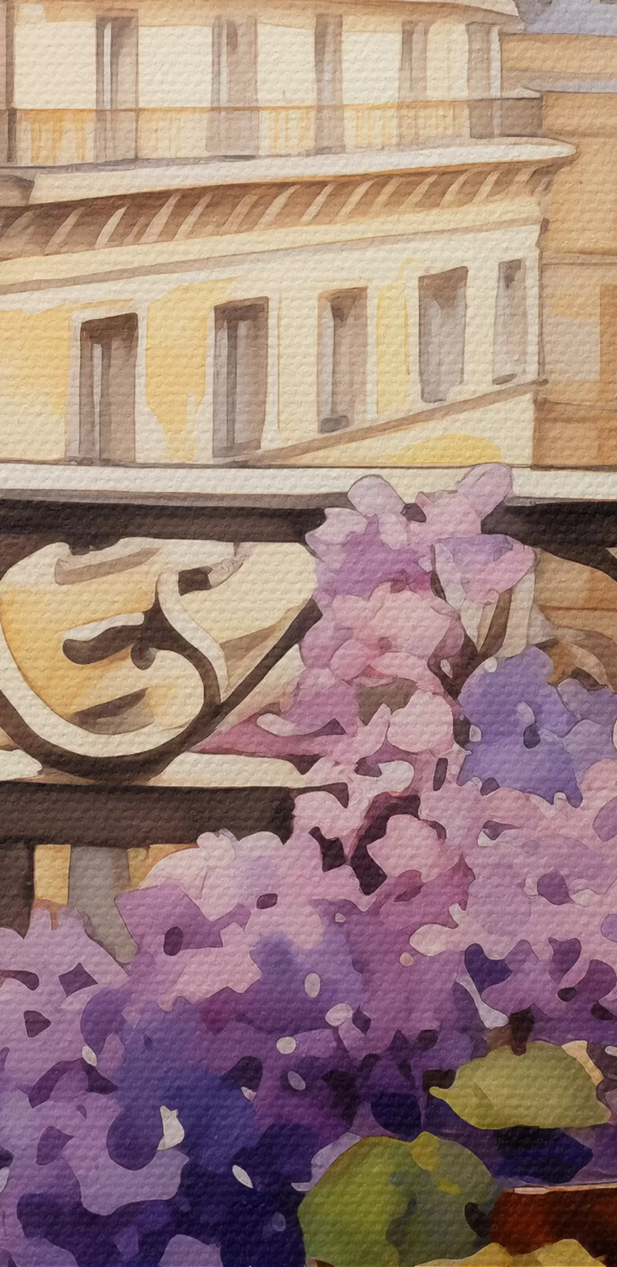Tablouri Violete într-o oală pe un balcon din Paris acuarelă s39931