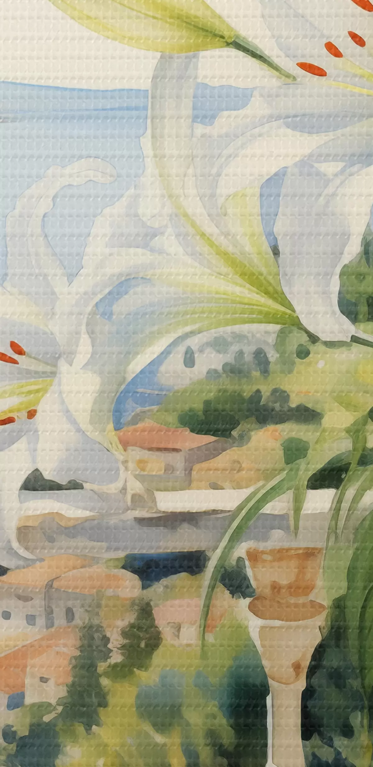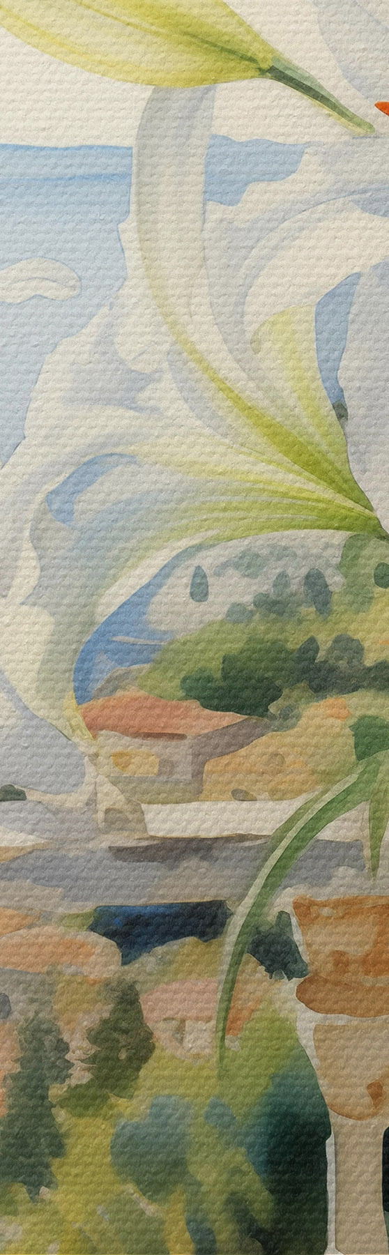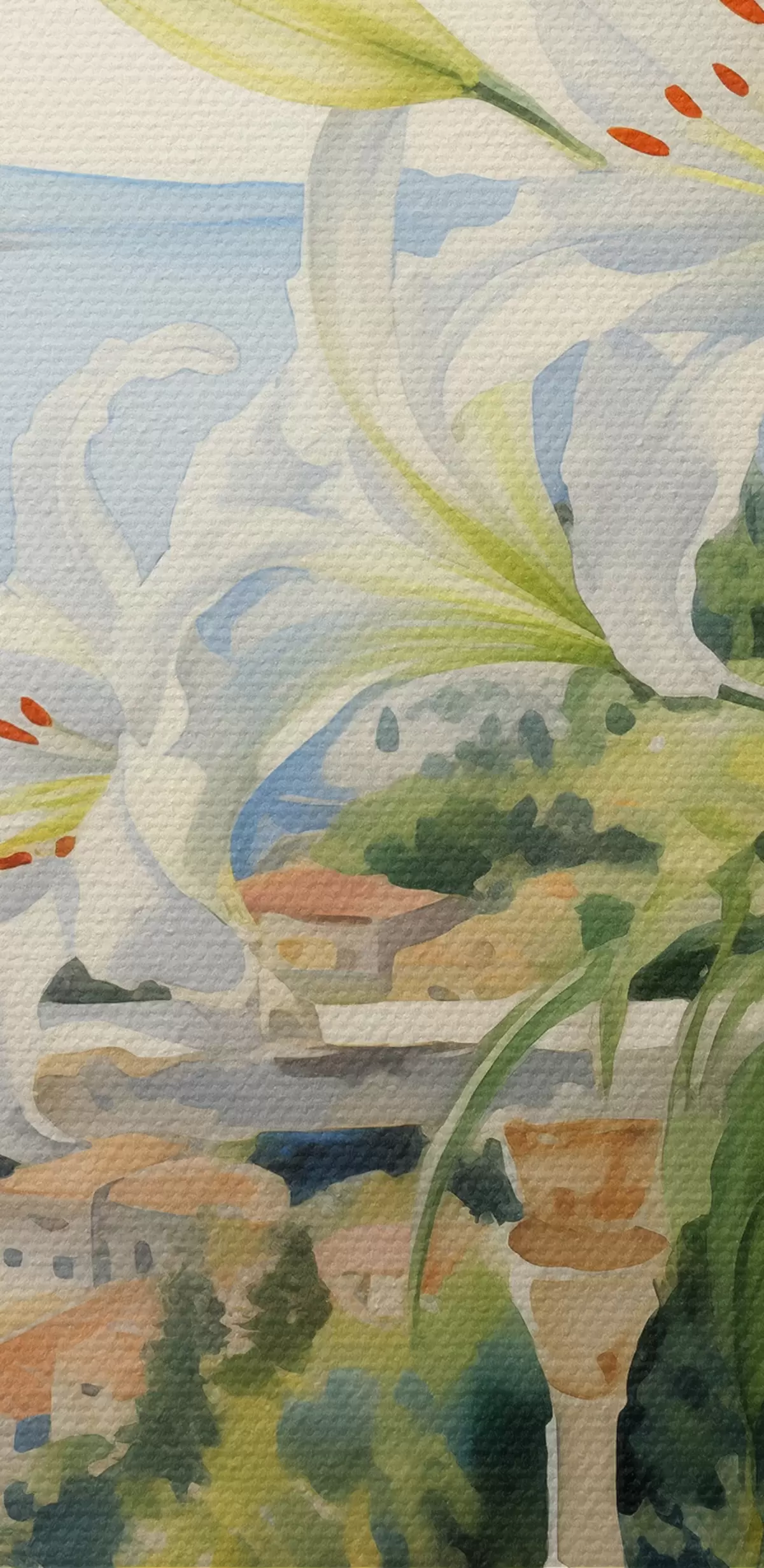 Pictură pe pânză Crini albi într-o oală pe un balcon pe fundalul golfului acuarelă Nr s39932