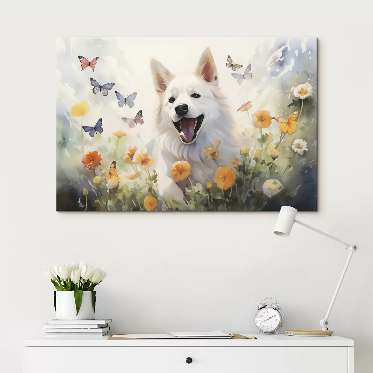 Pictură pe pânză Câine alb stă în flori, fluturi zboară acuarelă Nr s39936