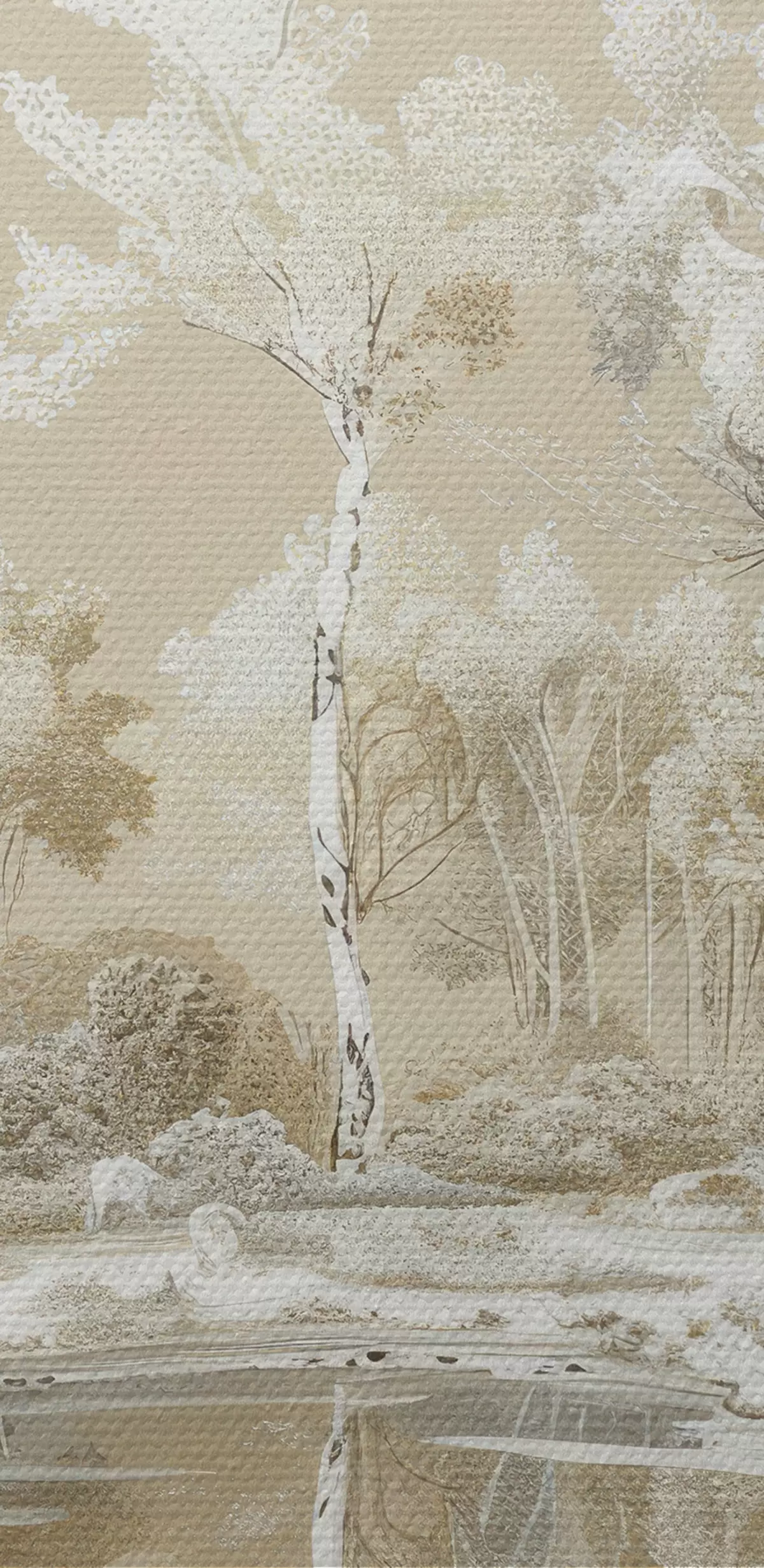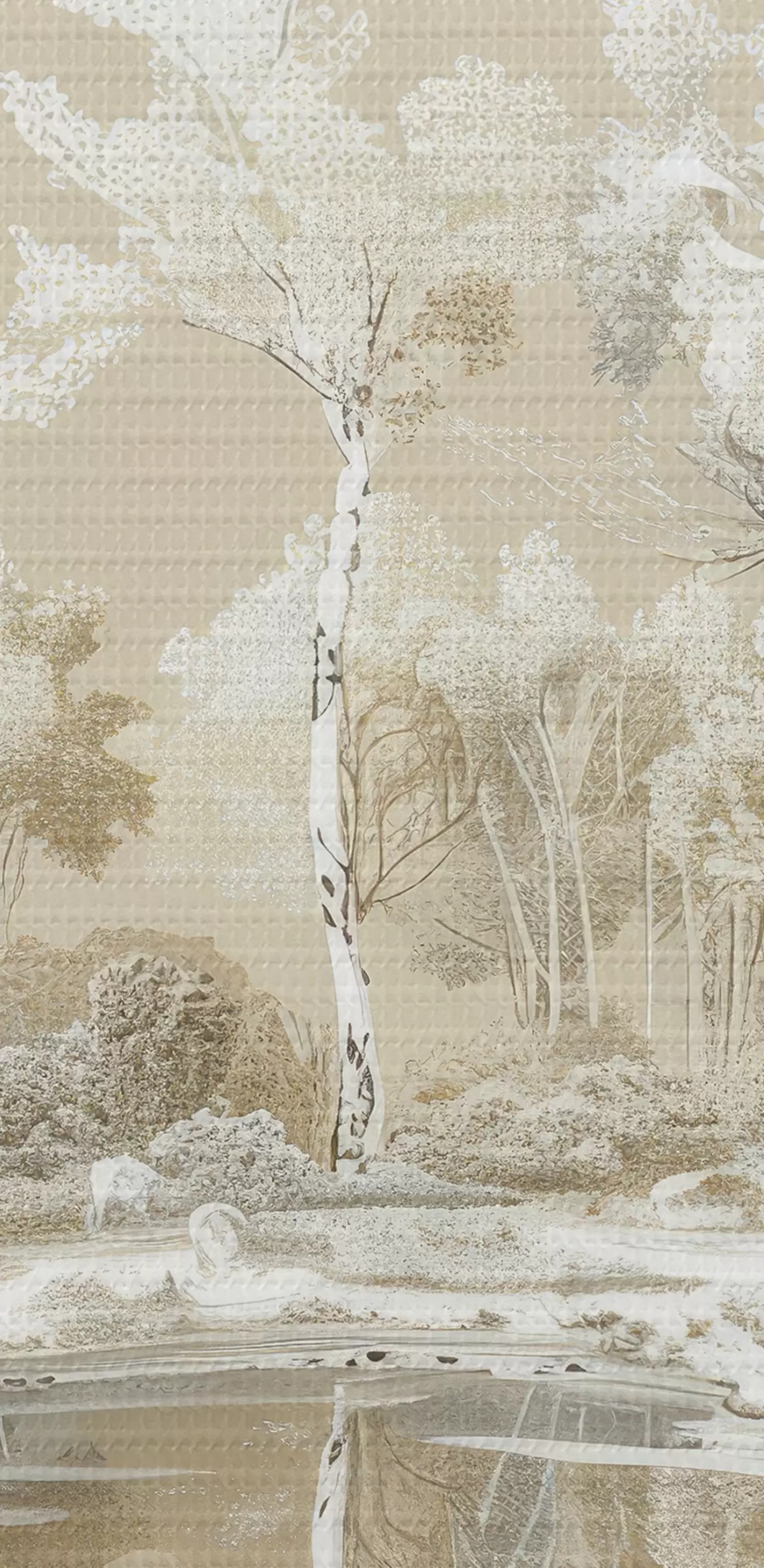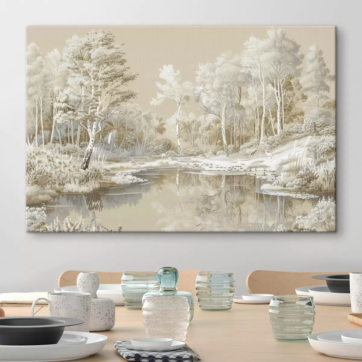 Tablouri Frumos peisaj forestier, iaz și copaci, culori bej și alb s39979