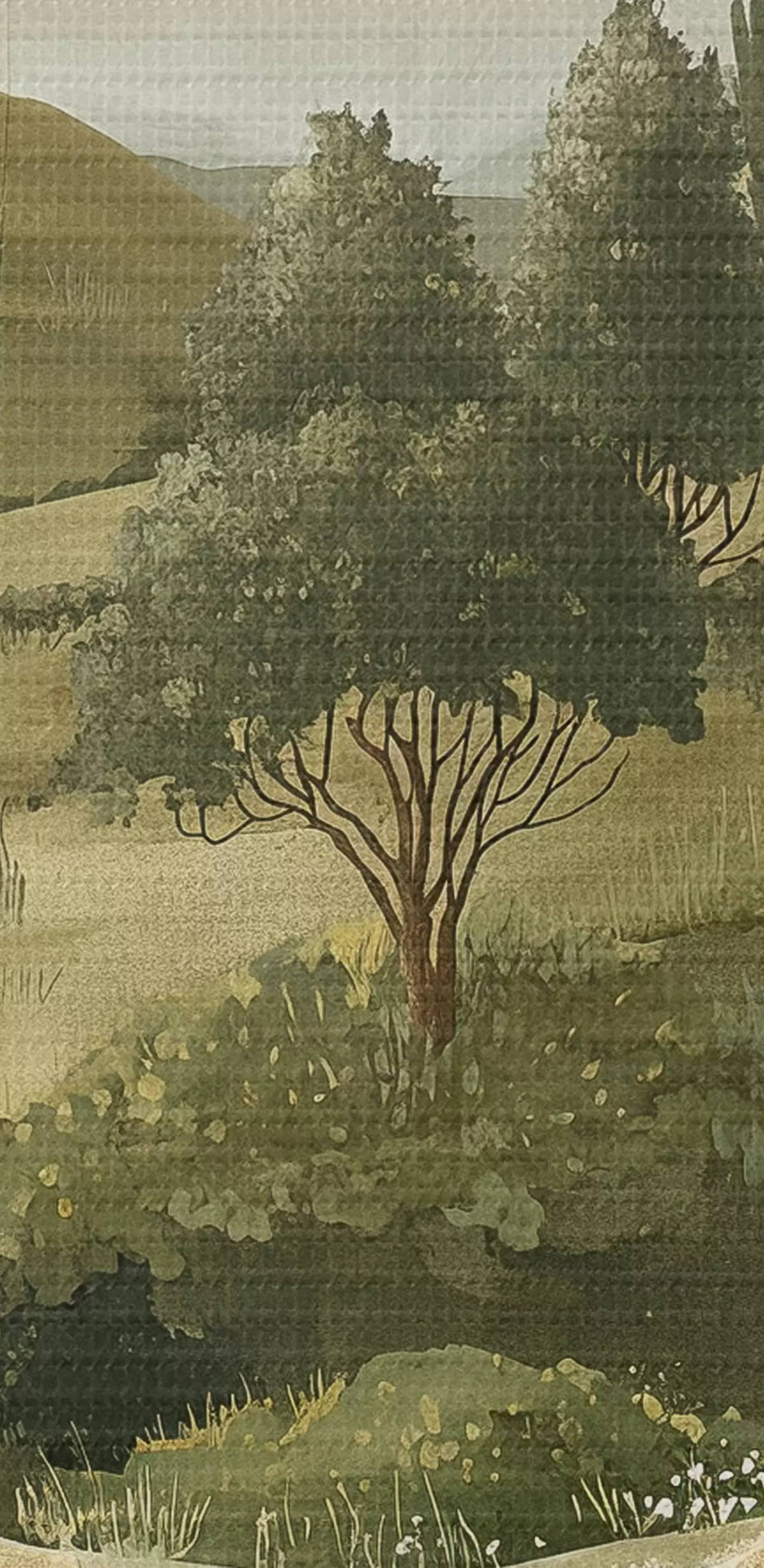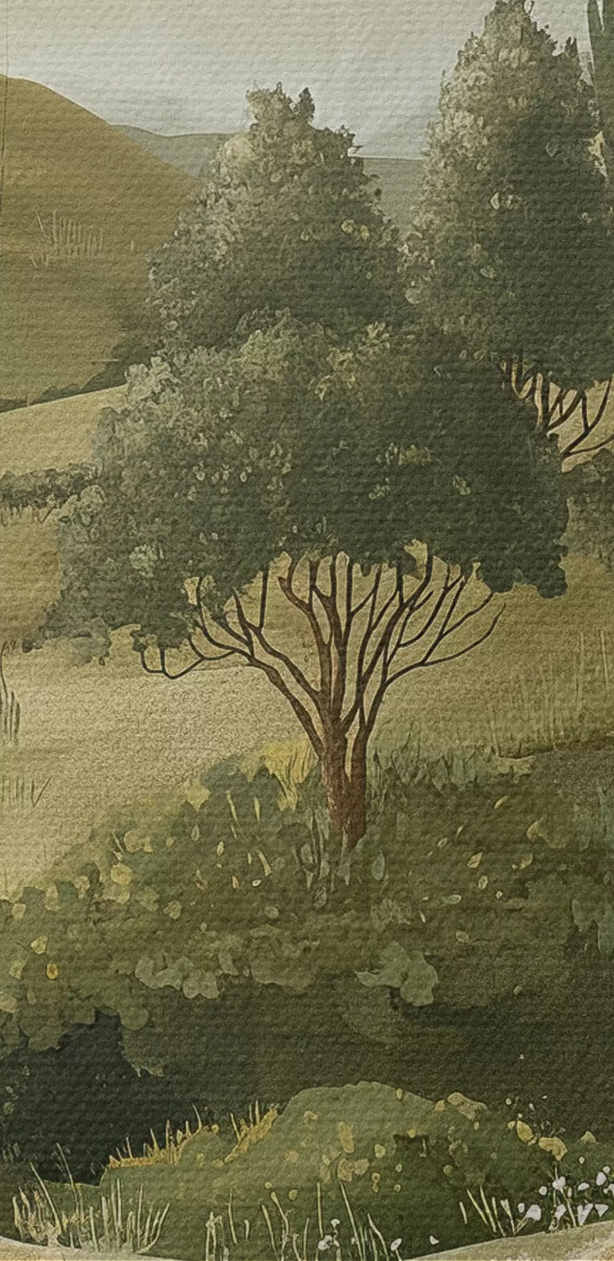 Tablouri Peisaj de epocă, stil rustic, culori pastelate, pajiște cu flori și copaci s40081
