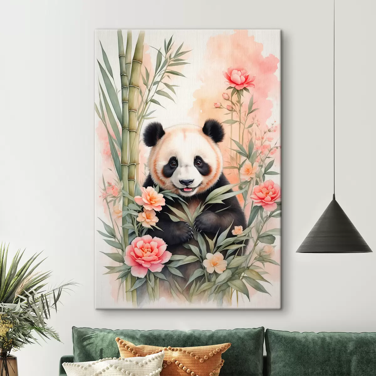 Pictură pe pânză Panda cu flori și bambus Nr s40125
