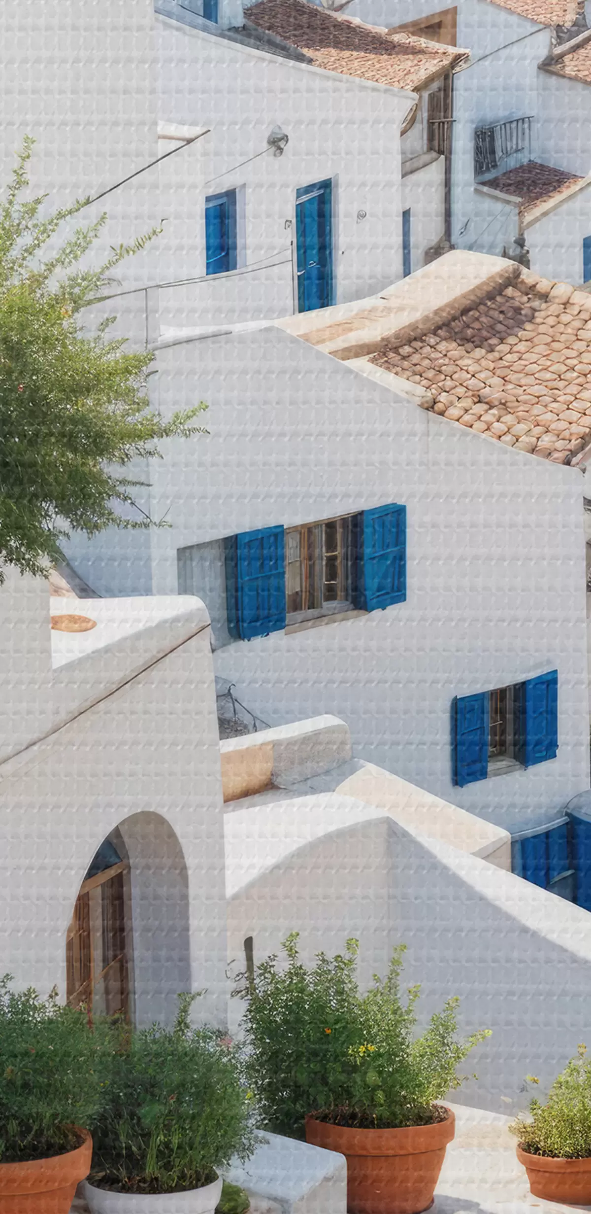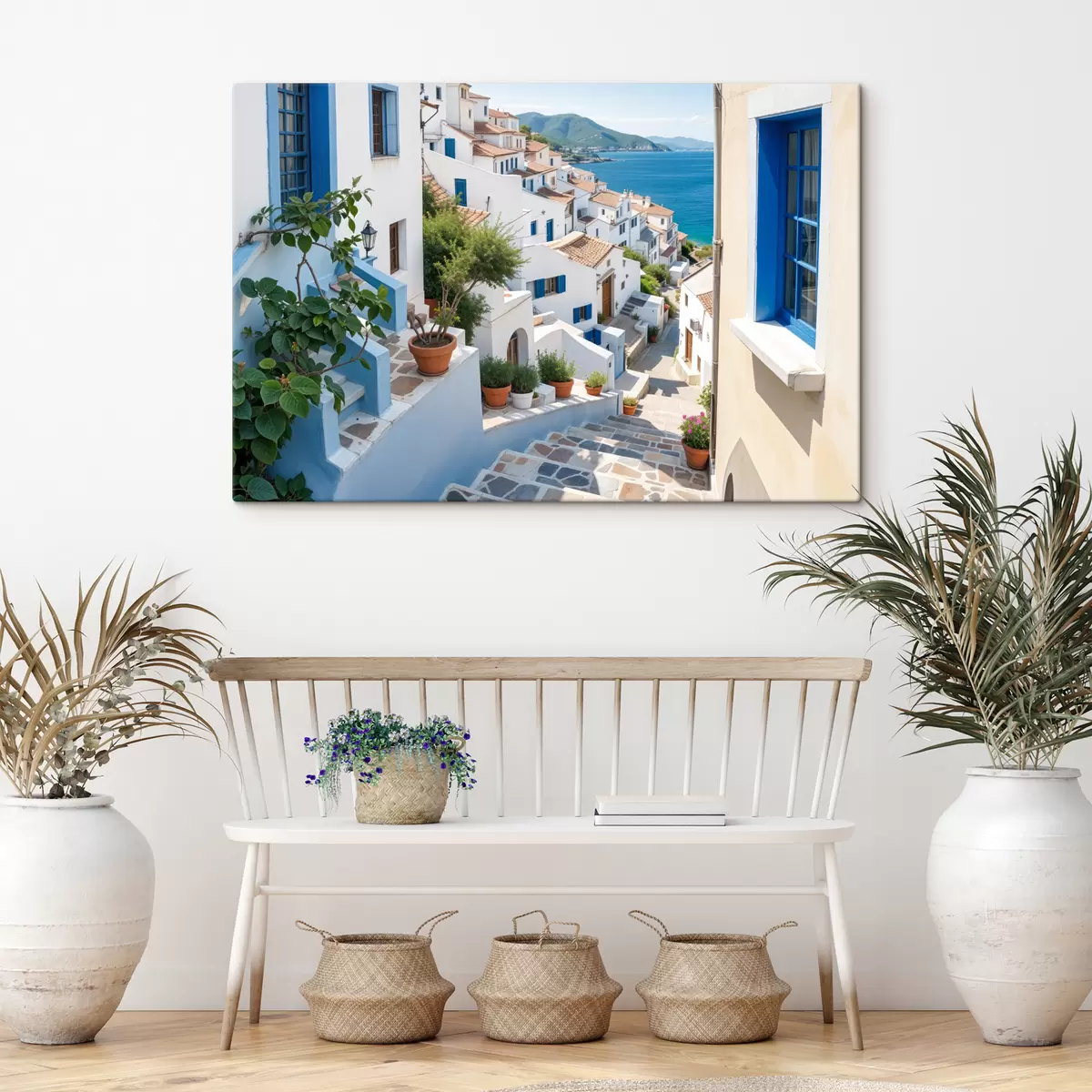Tablouri Un oraș de coastă pitoresc, cu clădiri albe, ferestre albastre și ghivece de plante pe străzile înguste s40148