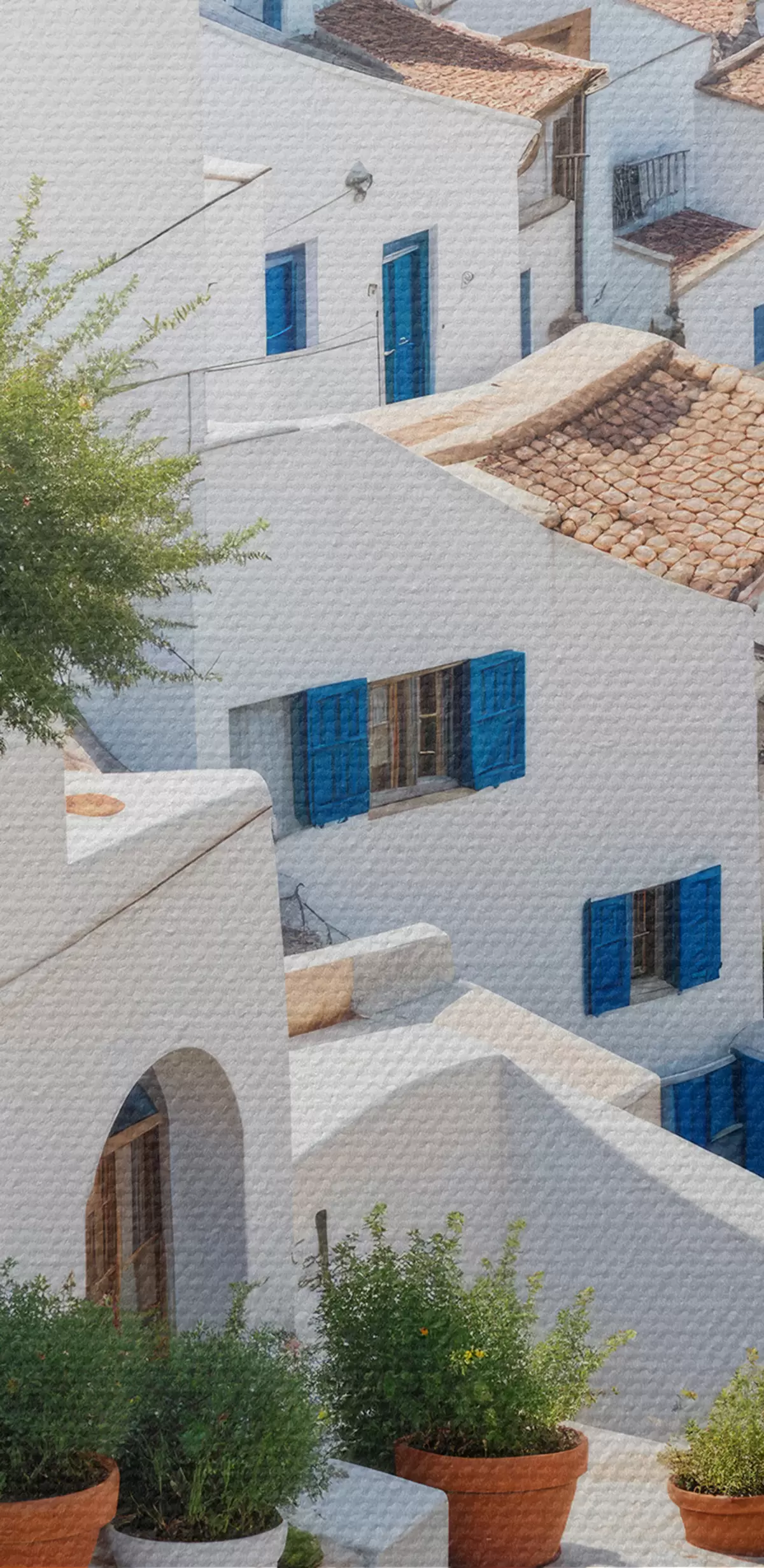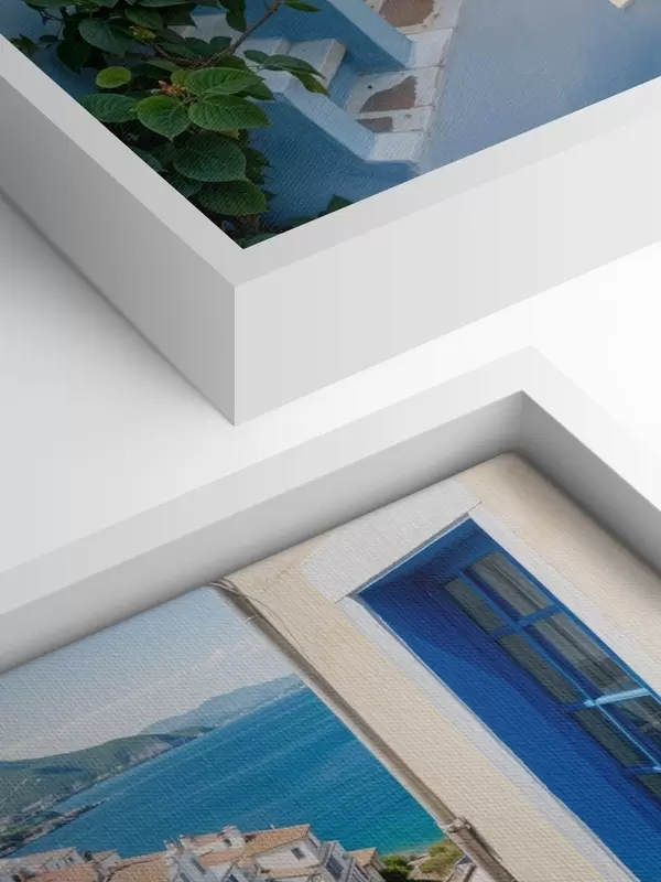 Pictură pe pânză Un oraș de coastă pitoresc, cu clădiri albe, ferestre albastre și ghivece de plante pe străzile înguste Nr s40148