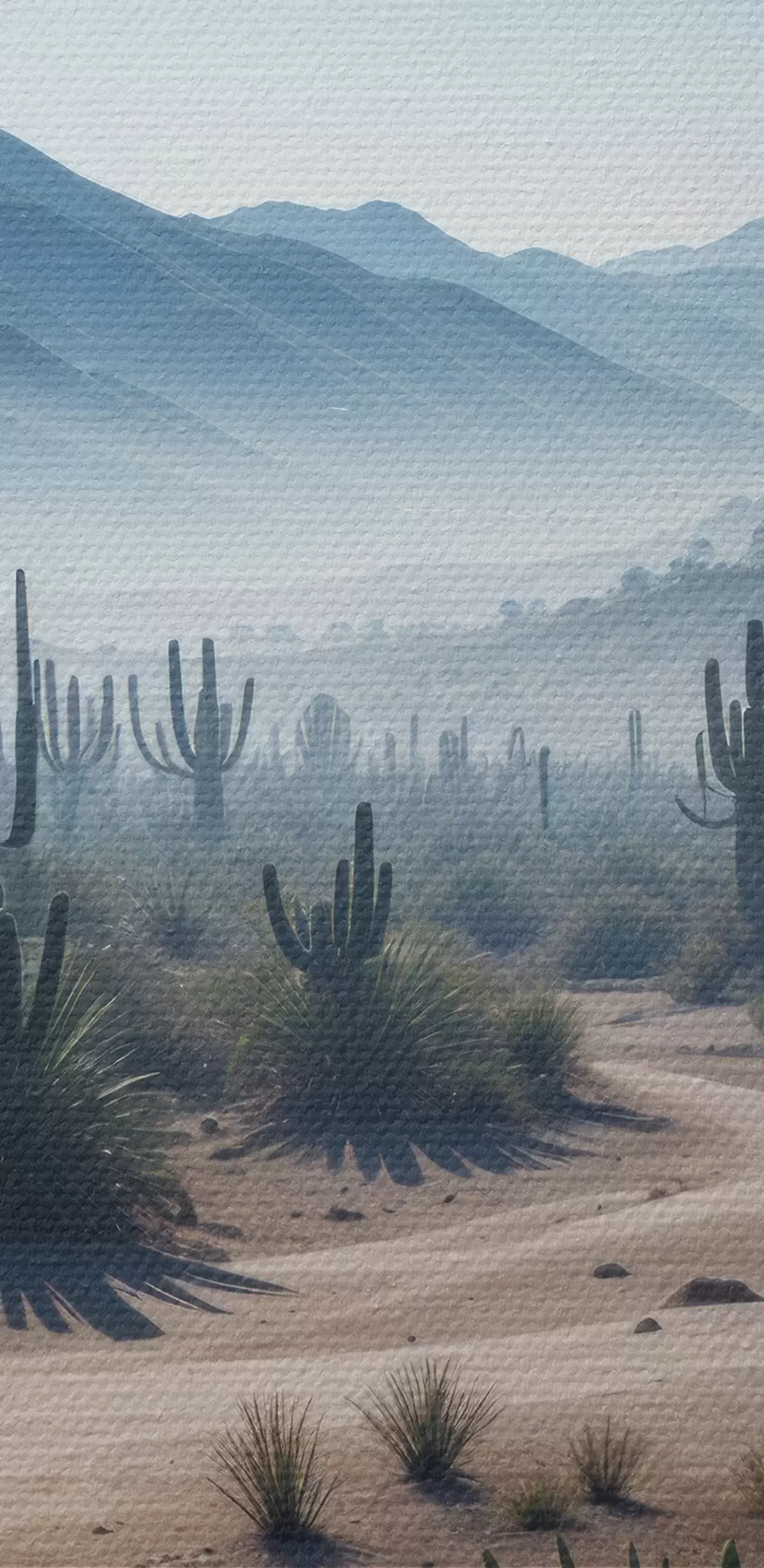 Pictură pe pânză Un peisaj deșertic cu cactuși înalți și plante yucca în prim-plan, înconjurat de munți cețoși Nr s40153