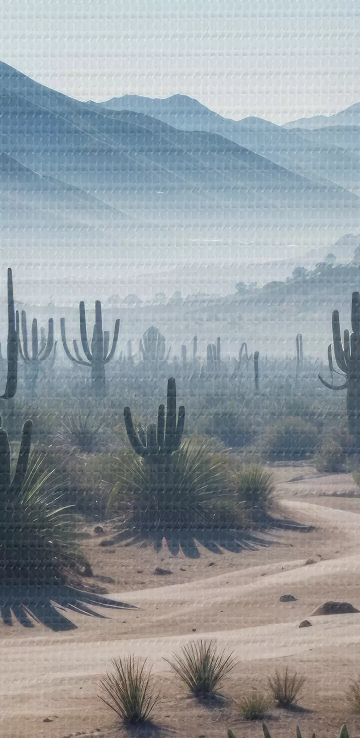 Tablouri Un peisaj deșertic cu cactuși înalți și plante yucca în prim-plan, înconjurat de munți cețoși s40153