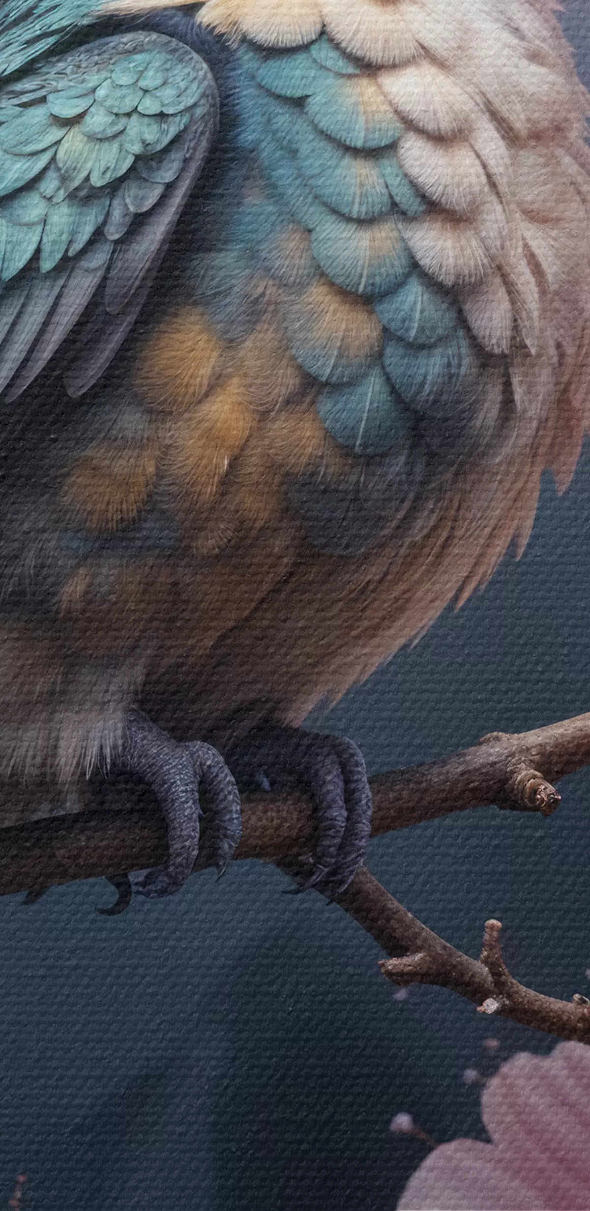 Pictură pe pânză O pasăre colibri colorată cocoțată pe o ramură cu flori roz vibrante în fundal Nr s40155
