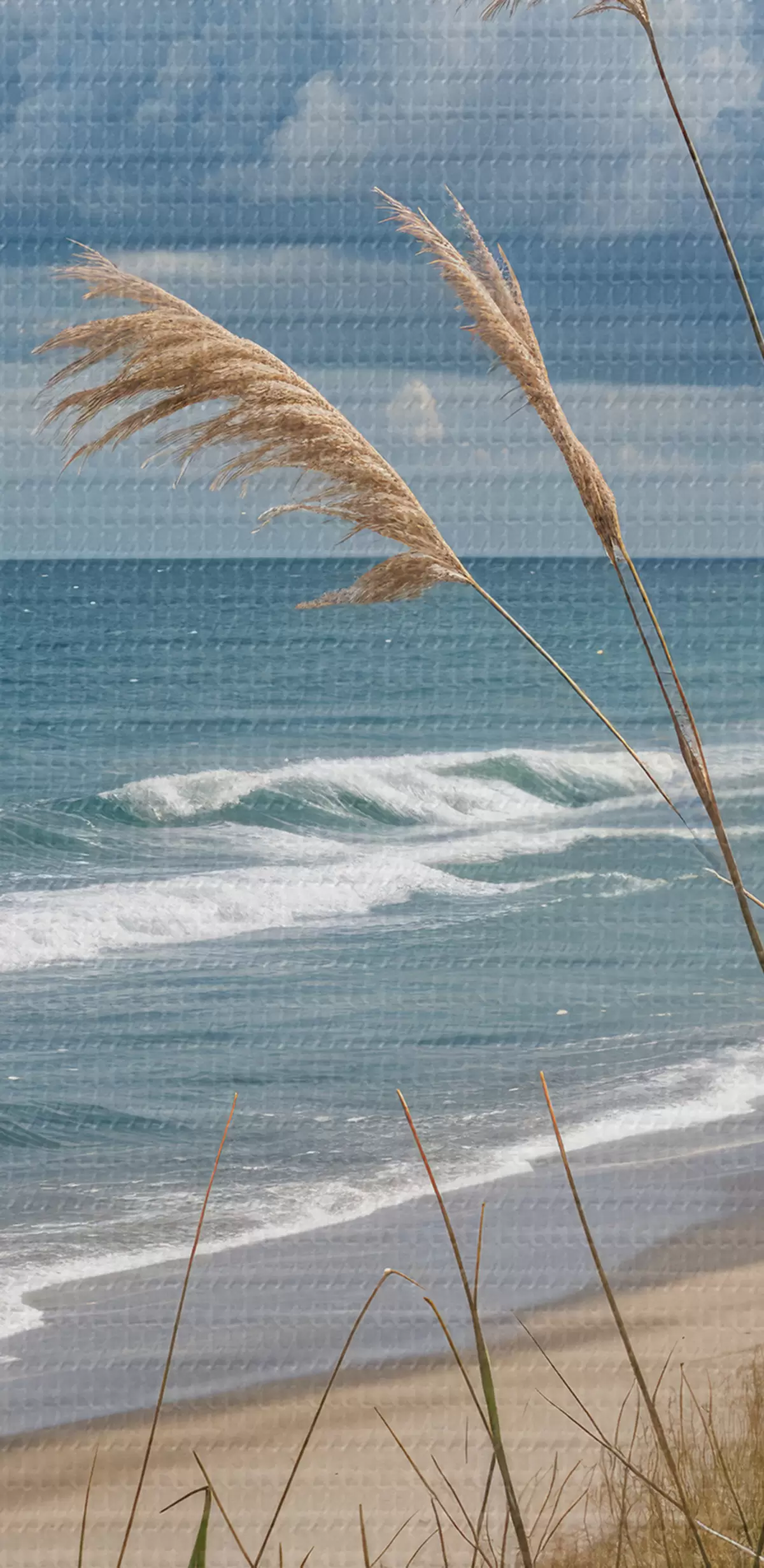 Tablouri O plajă pitorească cu iarbă înaltă legănată de vânt, cu vedere la ocean cu valuri care se sparg și un cer înnorat s40161