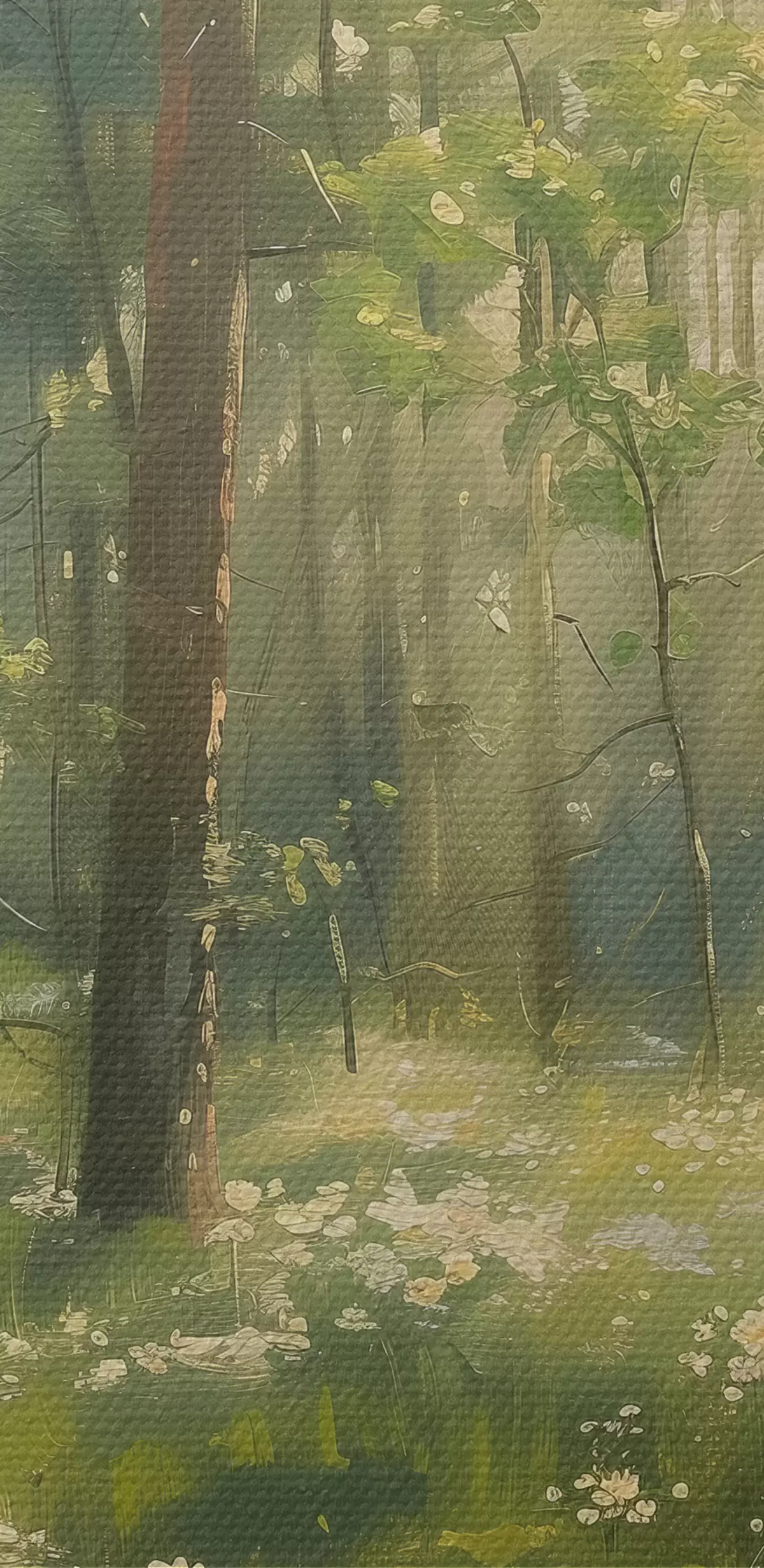Tablouri Pădure cu lumina soarelui în copaci, flori de mușețel, iarbă verde, desen acrilic s40226