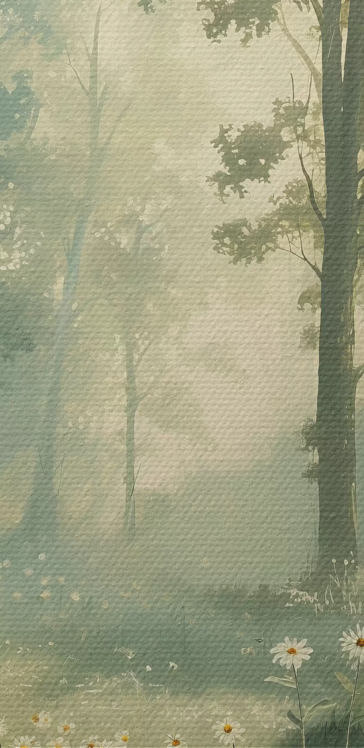 Tablouri Pădure cu lumina soarelui moale, flori de mușețel, copaci, iarbă verde, desen acrilic s40228