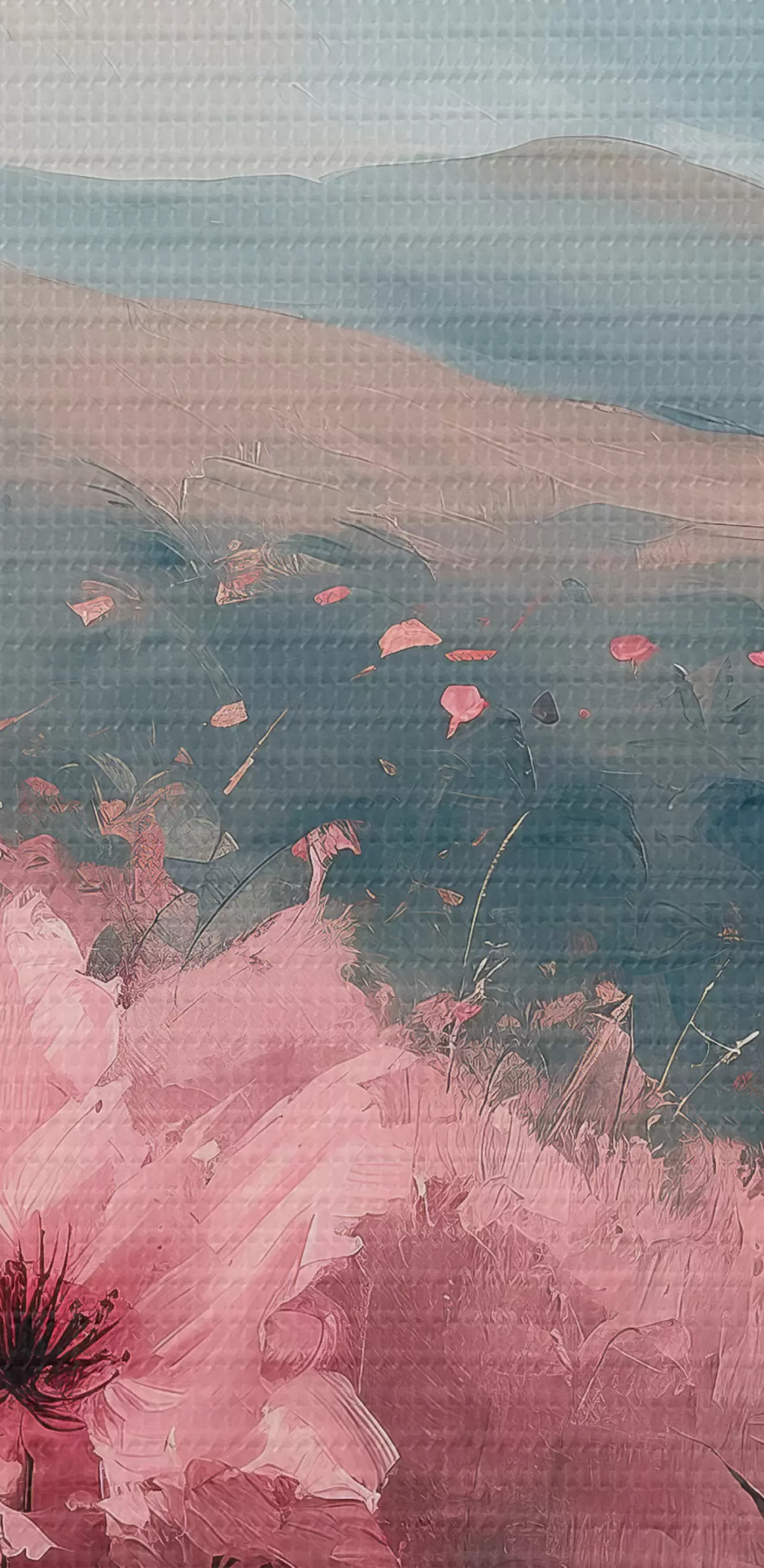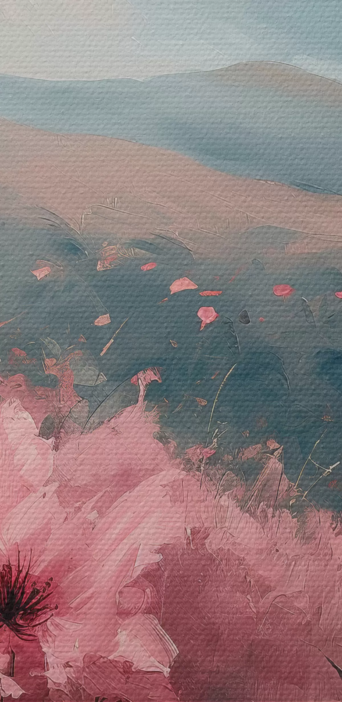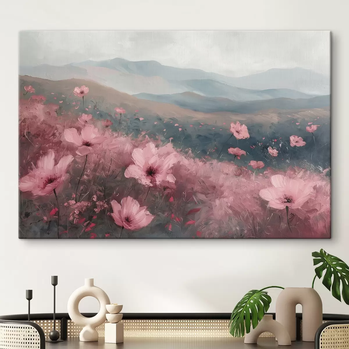 Tablouri Flori roz în pajiște, peisaj natural, munți, pictură în ulei, tușe de perie vii s40233