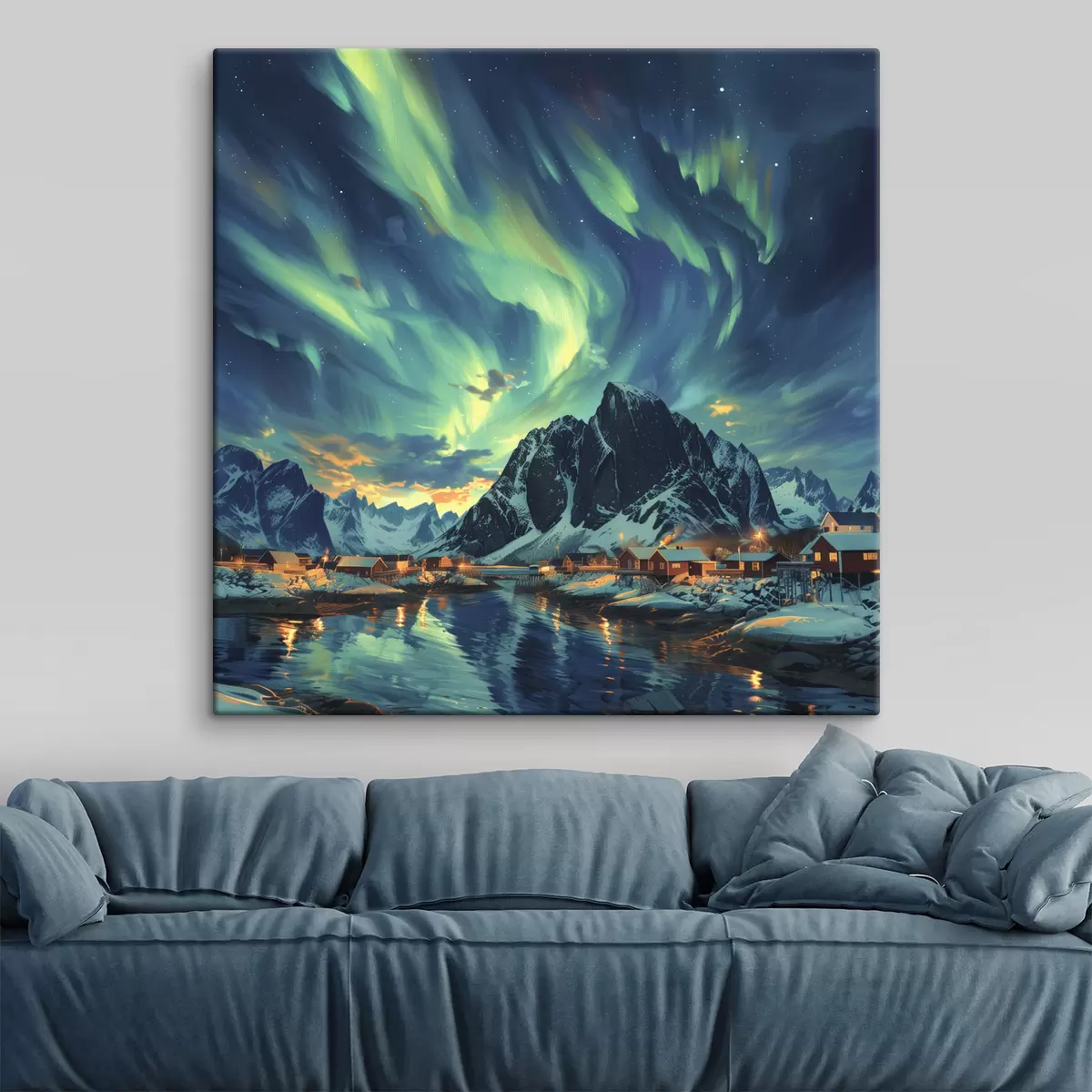 Pictură pe pânză Insulele Lofoten, lumini nordice, sat de iarnă Nr s40299
