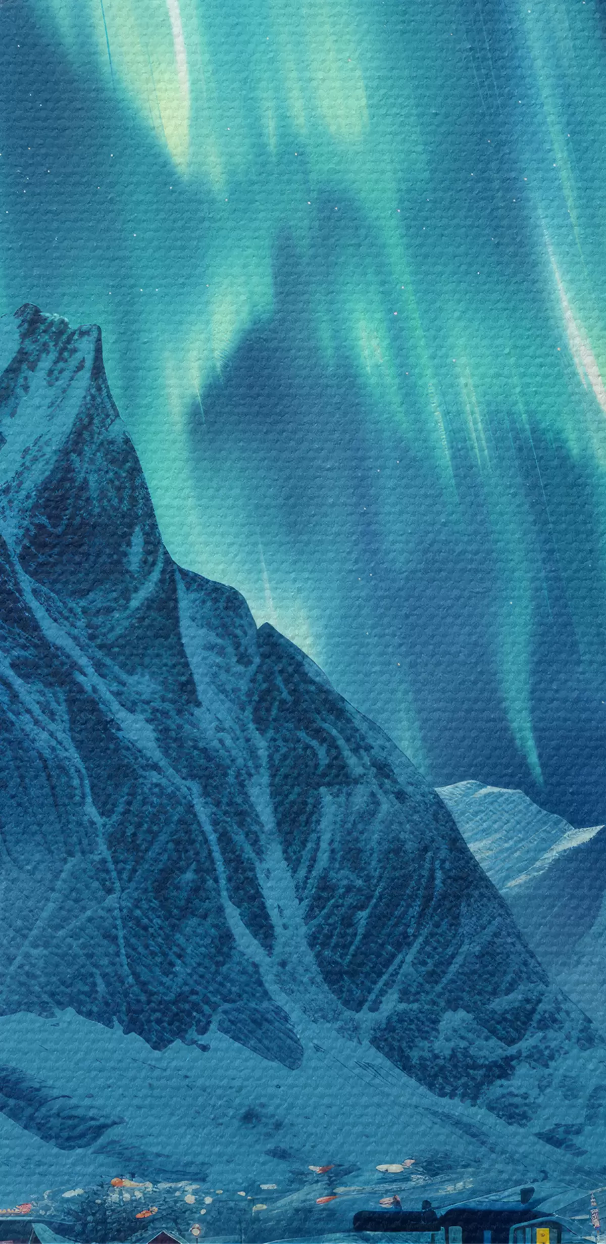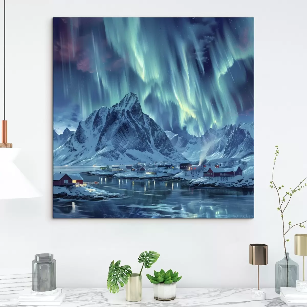 Pictură pe pânză Lumini nordice magice, sat de iarnă în Norvegia Nr s40301