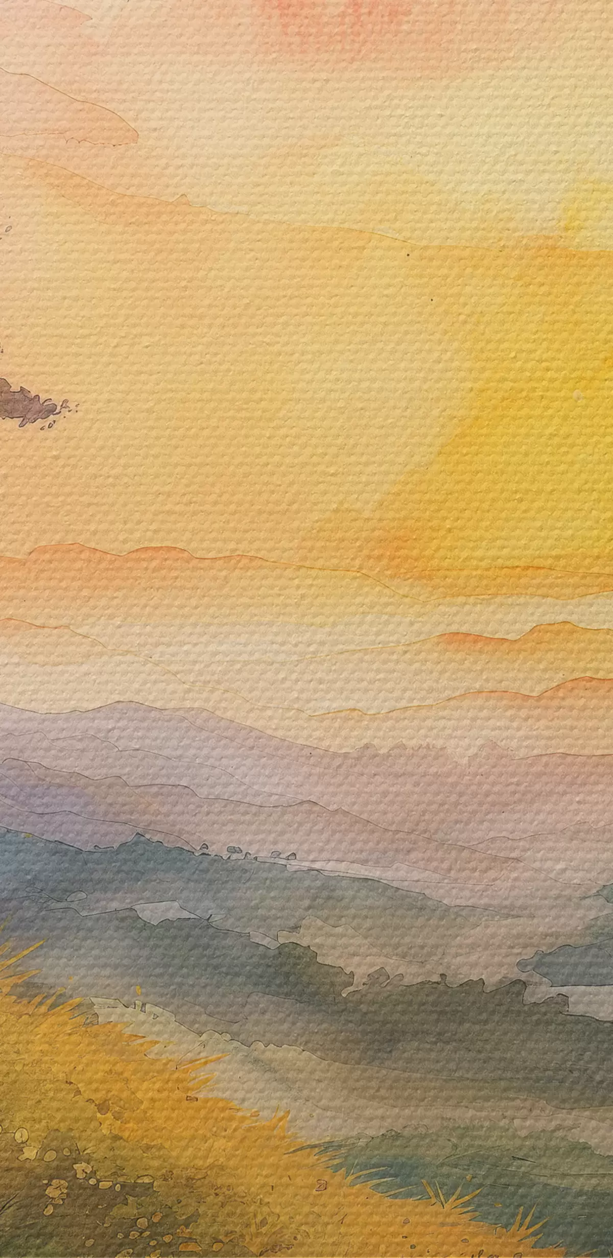 Tablouri Pajiște cu dealuri și copac, flori, acuarelă s40303