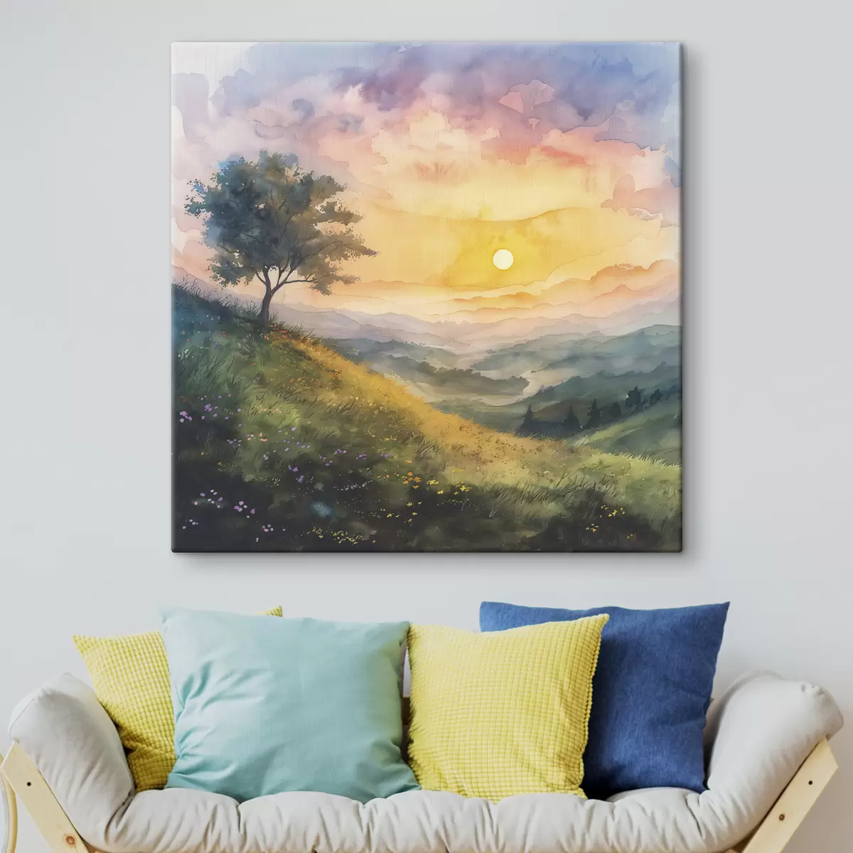 Pictură pe pânză Pajiște cu dealuri și copac, flori, acuarelă Nr s40303