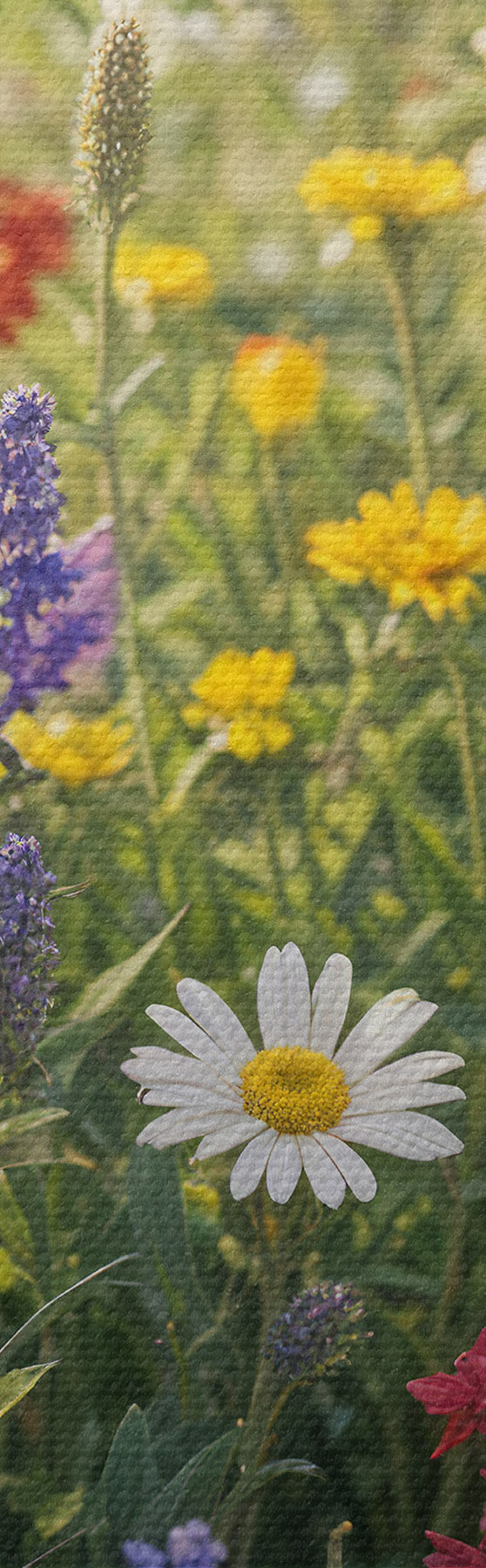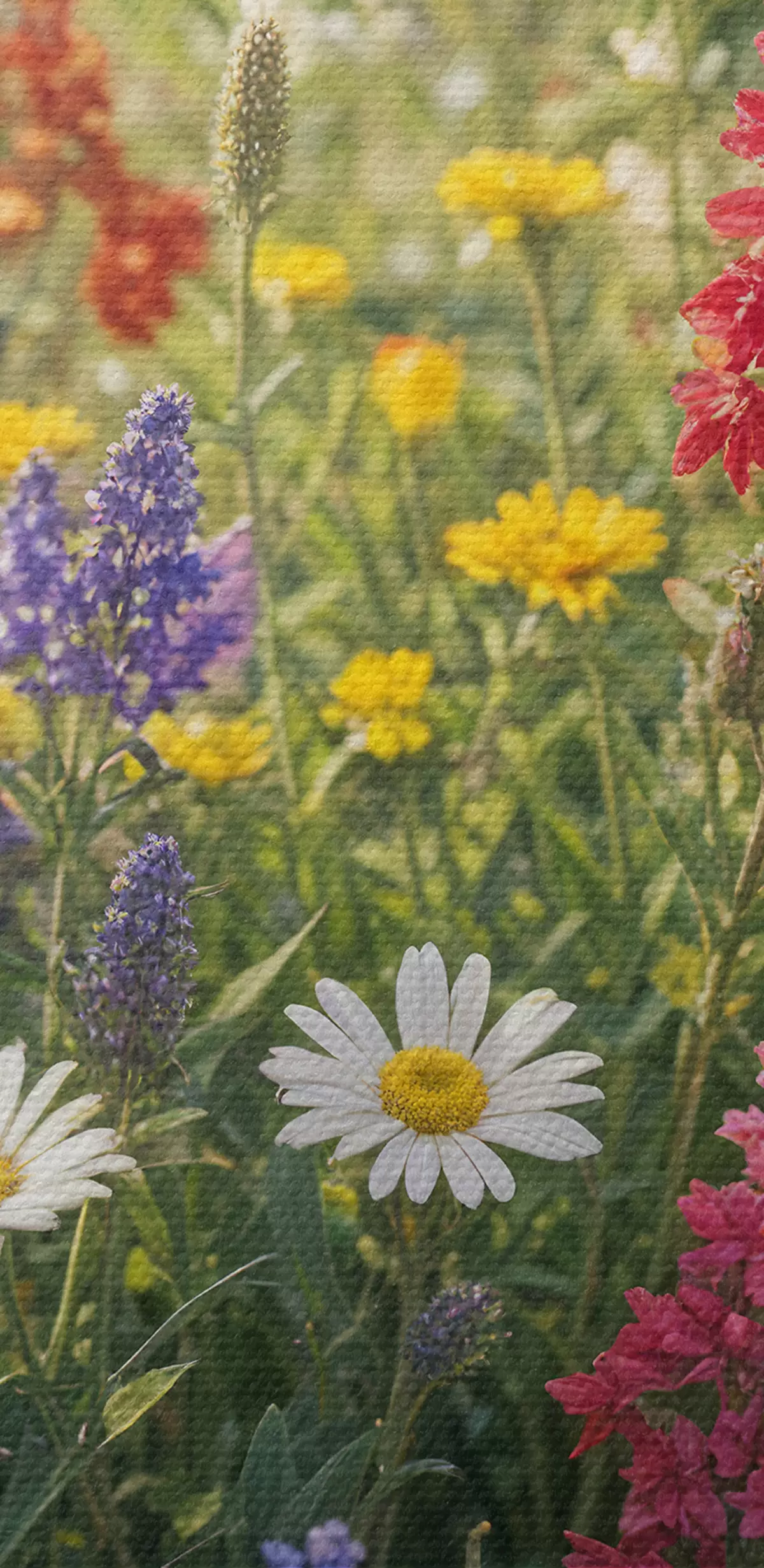 Pictură pe pânză O pajiște colorată cu flori sălbatice, cu diverse flori înflorite, inclusiv margarete, lavandă și flori roșii Nr s40390
