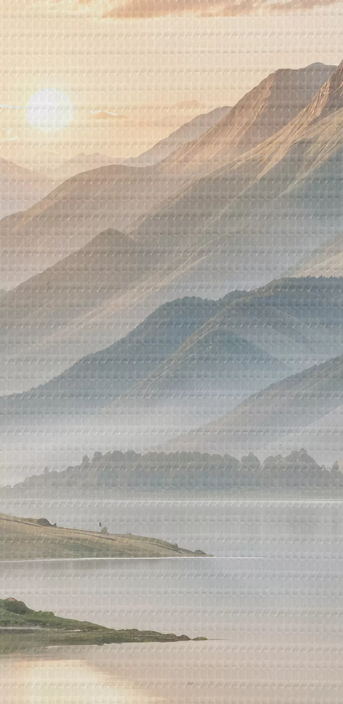 Pictură pe pânză Un peisaj senin cu un lac care reflectă munții în fundal cu o barcă mică pe apa calmă Nr s40391