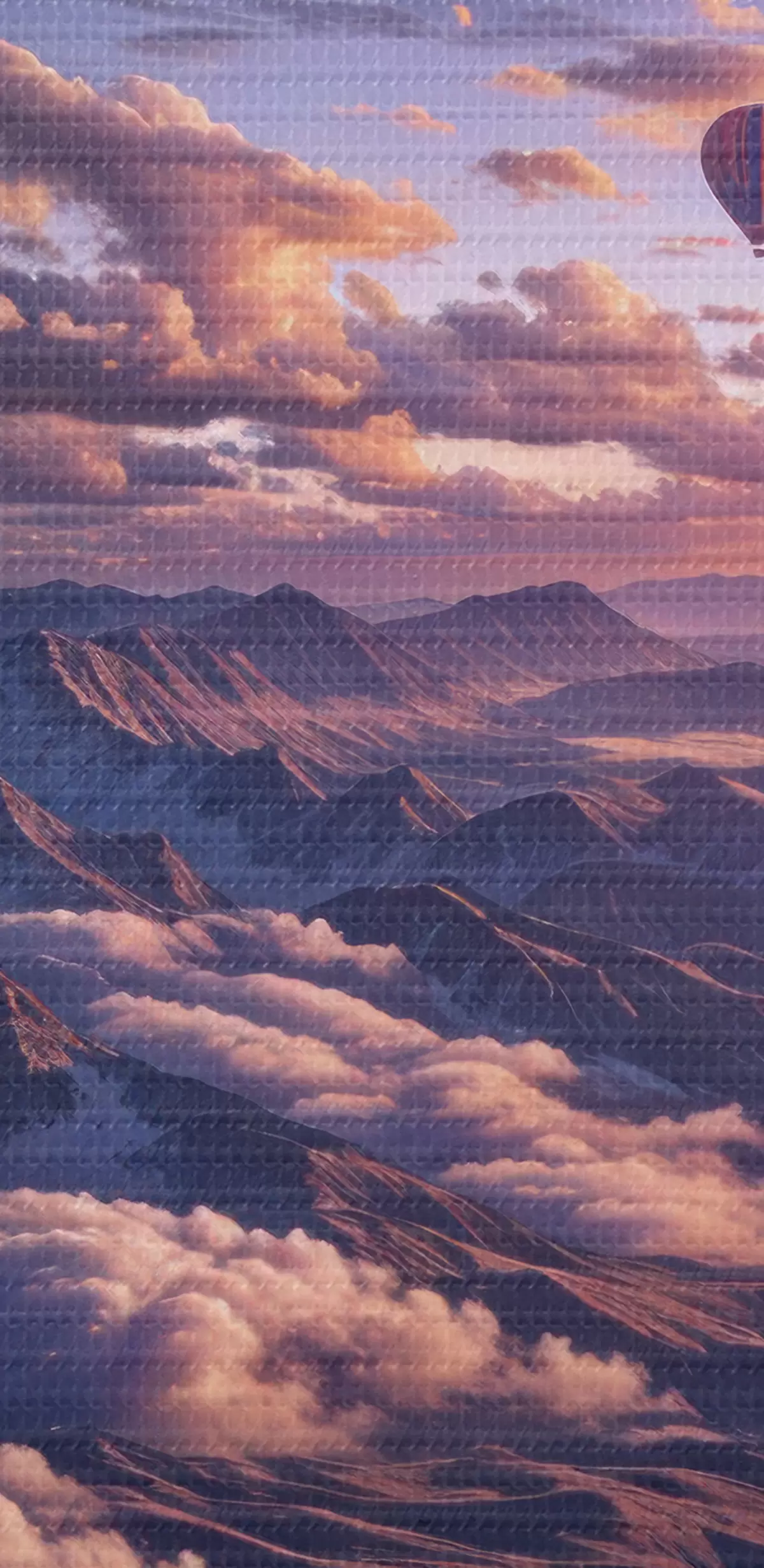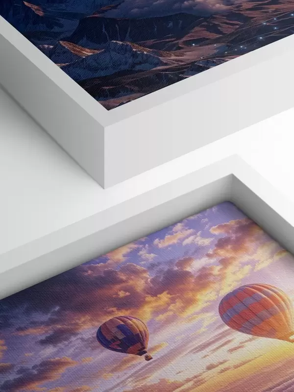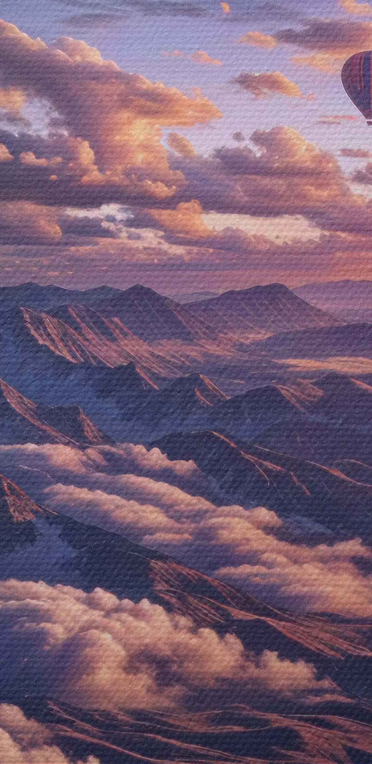 Pictură pe pânză Baloane cu aer cald plutesc deasupra unui peisaj montan la apus, cu nori și culori vibrante pe cer Nr s40397