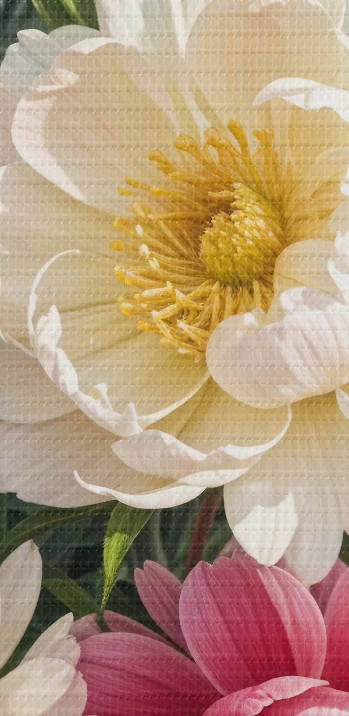 Tablouri Un buchet de flori vibrante de bujor în diferite nuanțe de roz, alb și galben, cu stropi de vopsea s40403