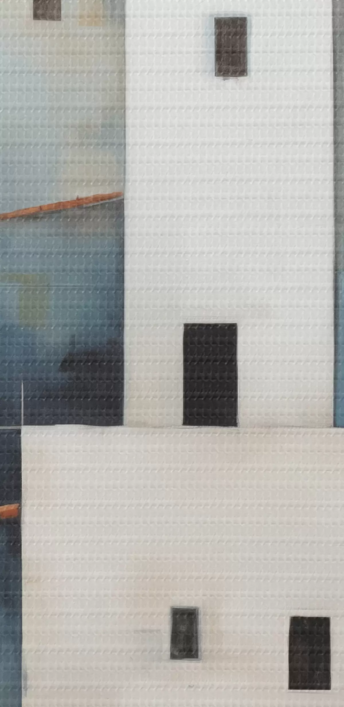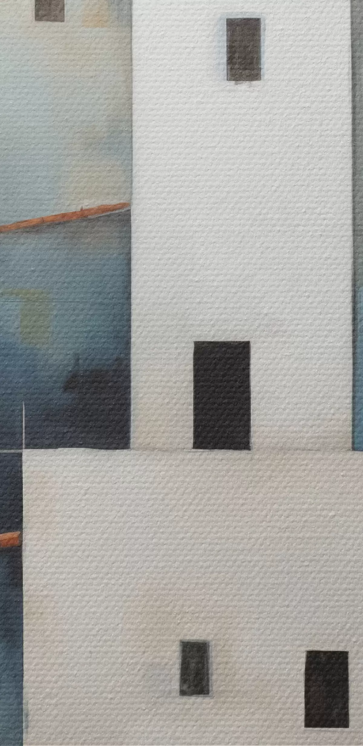 Pictură pe pânză Case albe stilizate abstracte, rosu, portocaliu, galben, albastru Nr s40531