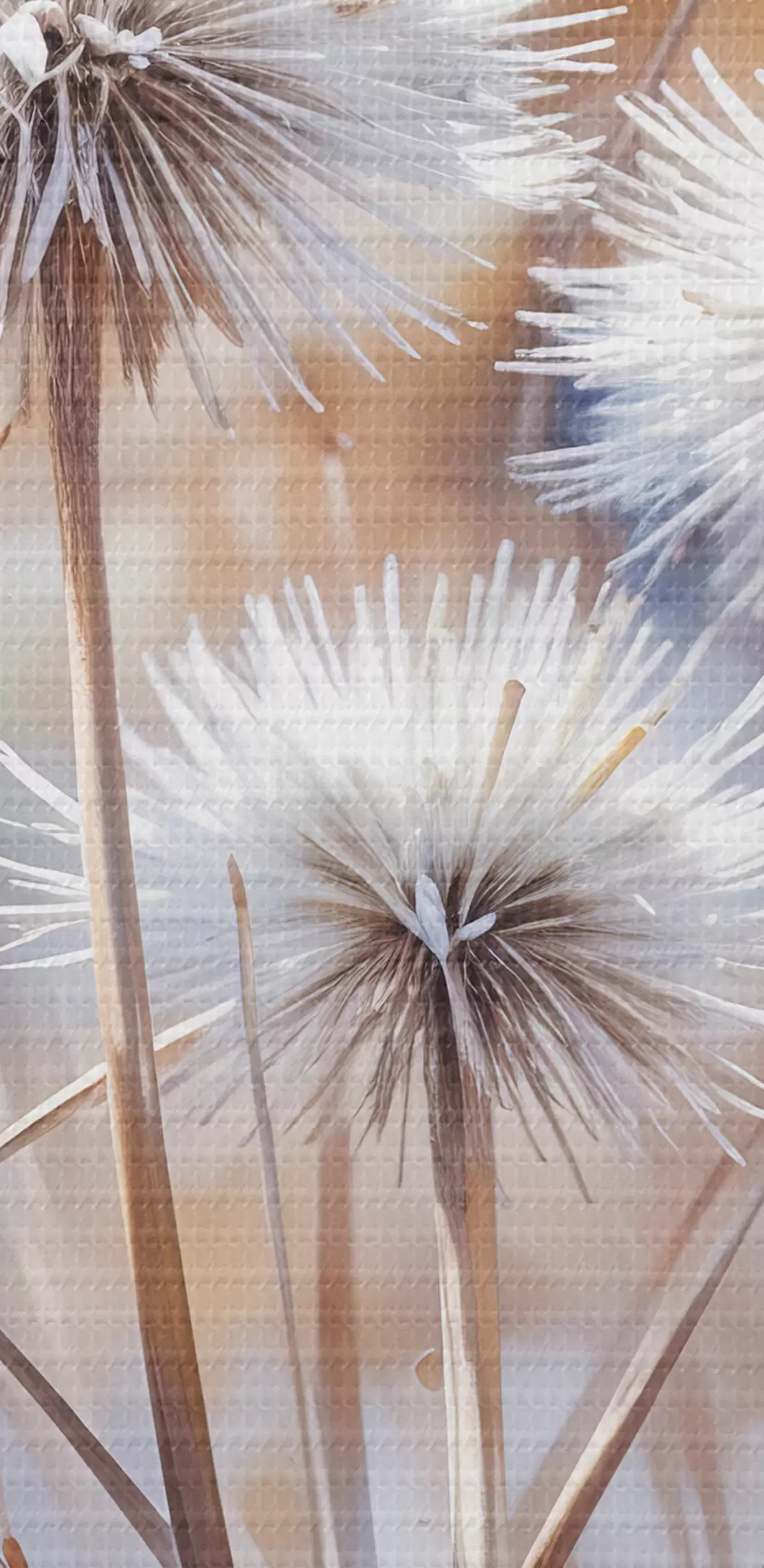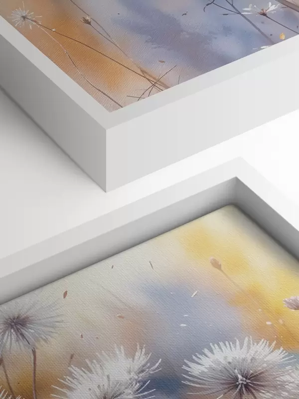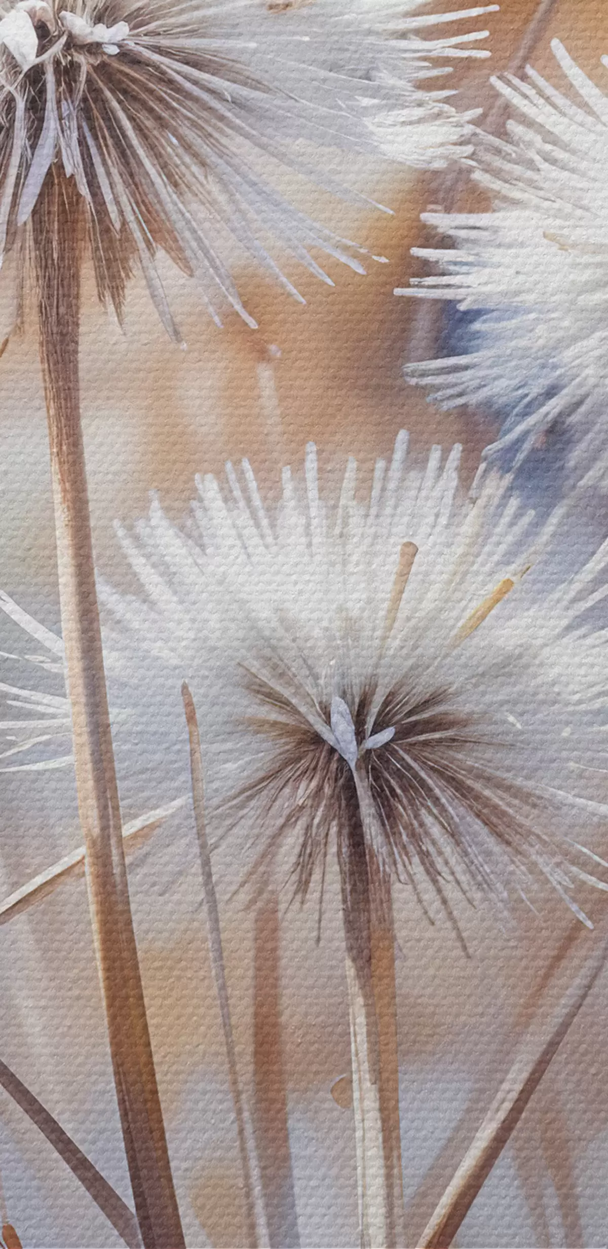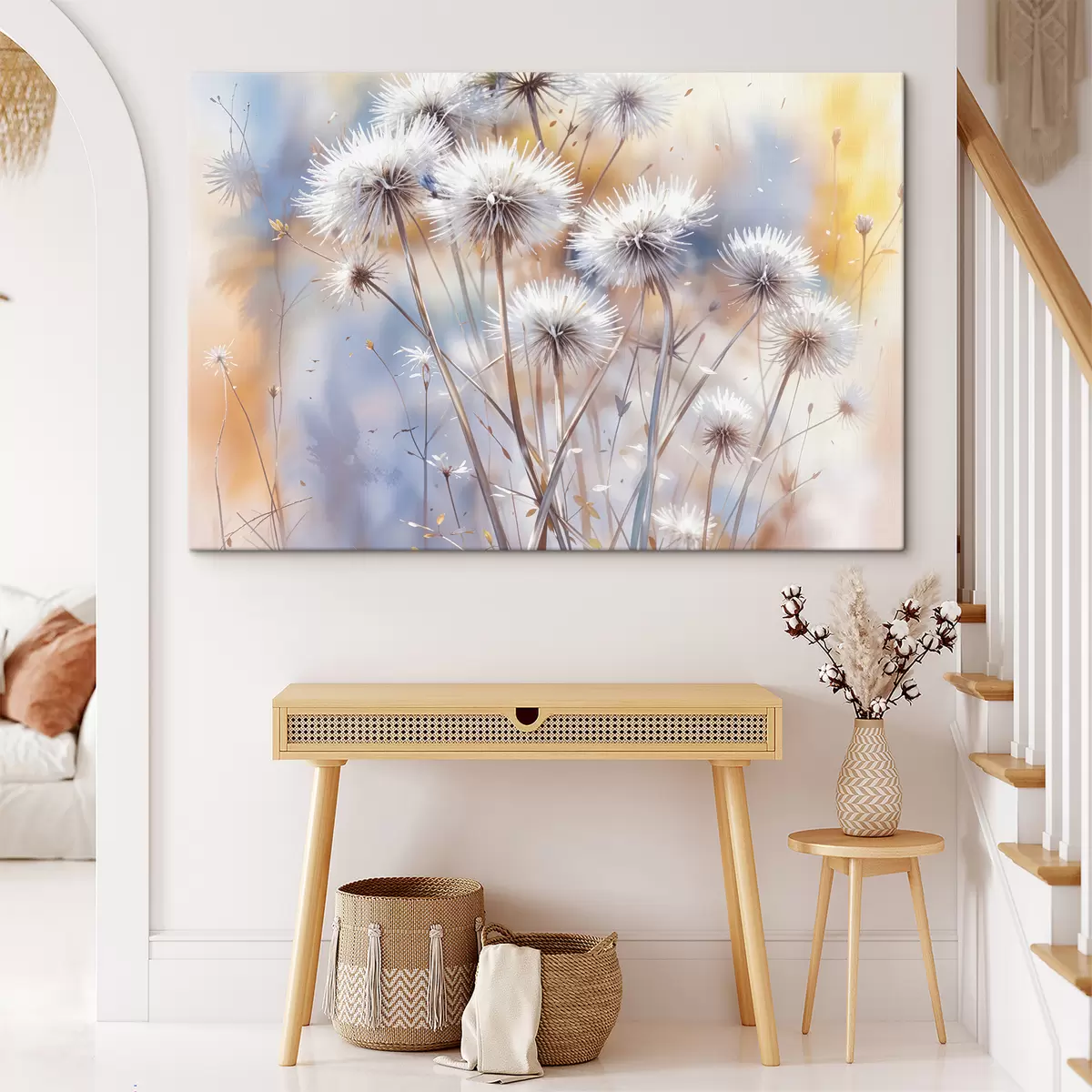 Pictură pe pânză Flori albe de păpădie pufoase pe un fundal neclar de acuarelă cu iluminare caldă Nr s40541