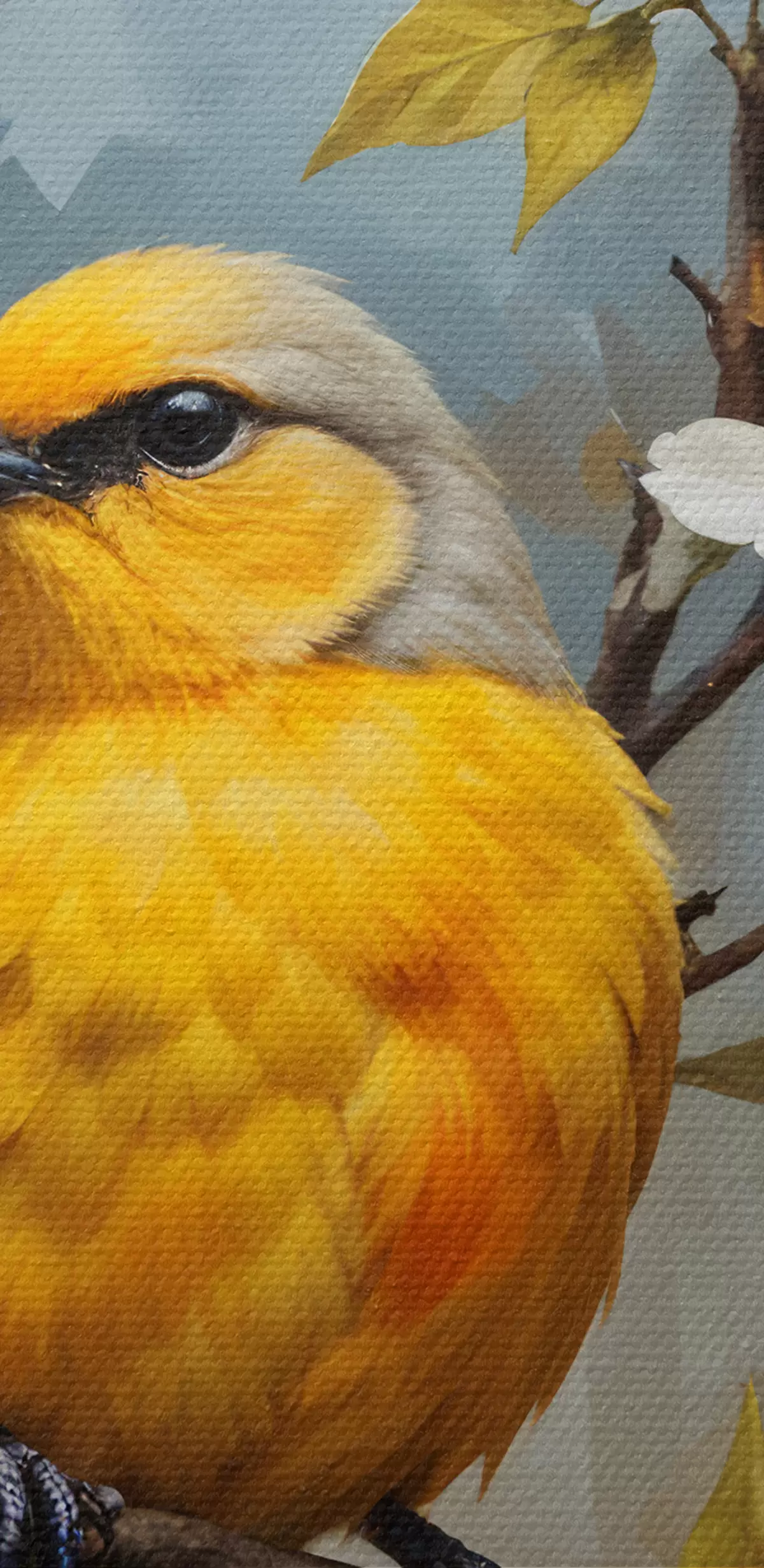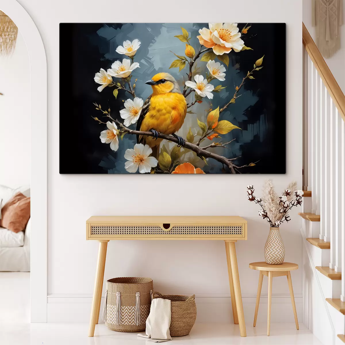 Pictură pe pânză O pasăre galbenă cocoțată pe o ramură cu flori albe și portocalii în fundal Nr s40550