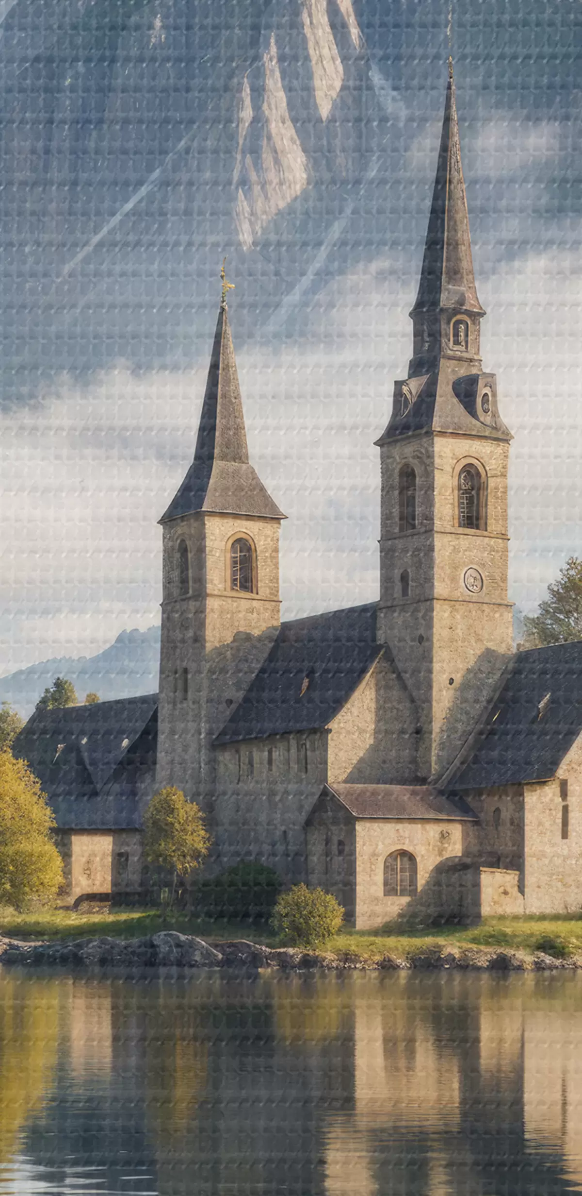 Pictură pe pânză Un sat alpin pitoresc cuibarit de-a lungul unui lac senin, cu munți falnici acoperiți de zăpadă Nr s40554
