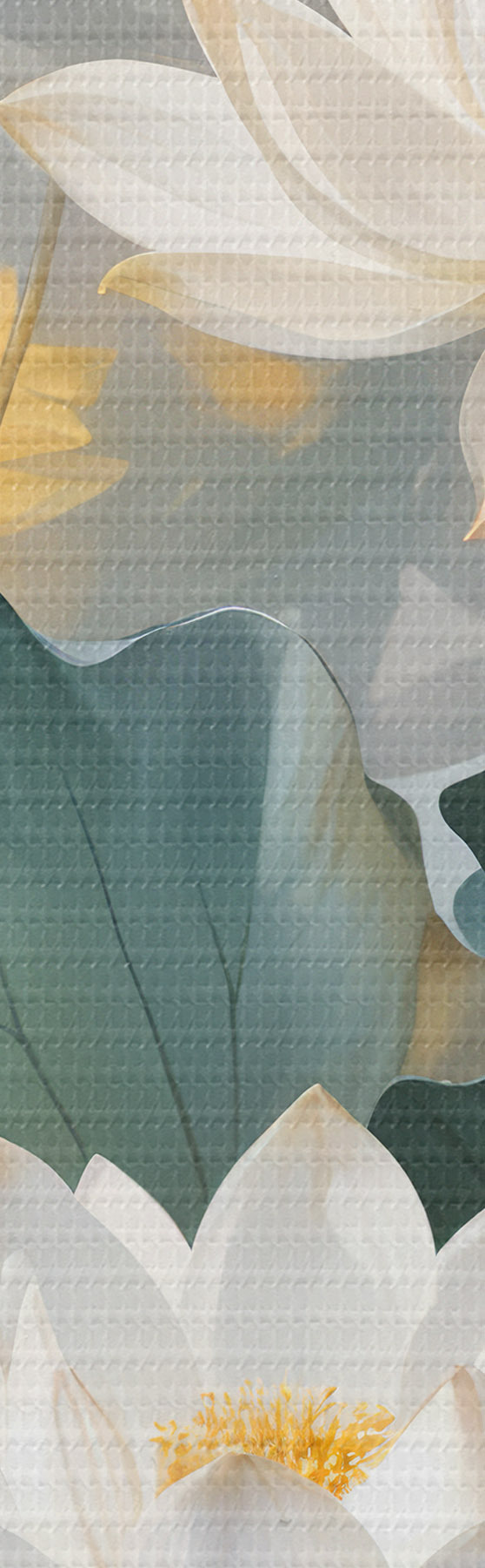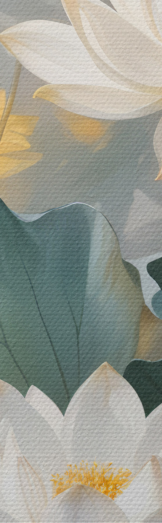 Pictură pe pânză Flori albe de lotus într-un iaz cu crin verzi, înconjurate de flori galbene și un fundal neclar Nr s40559