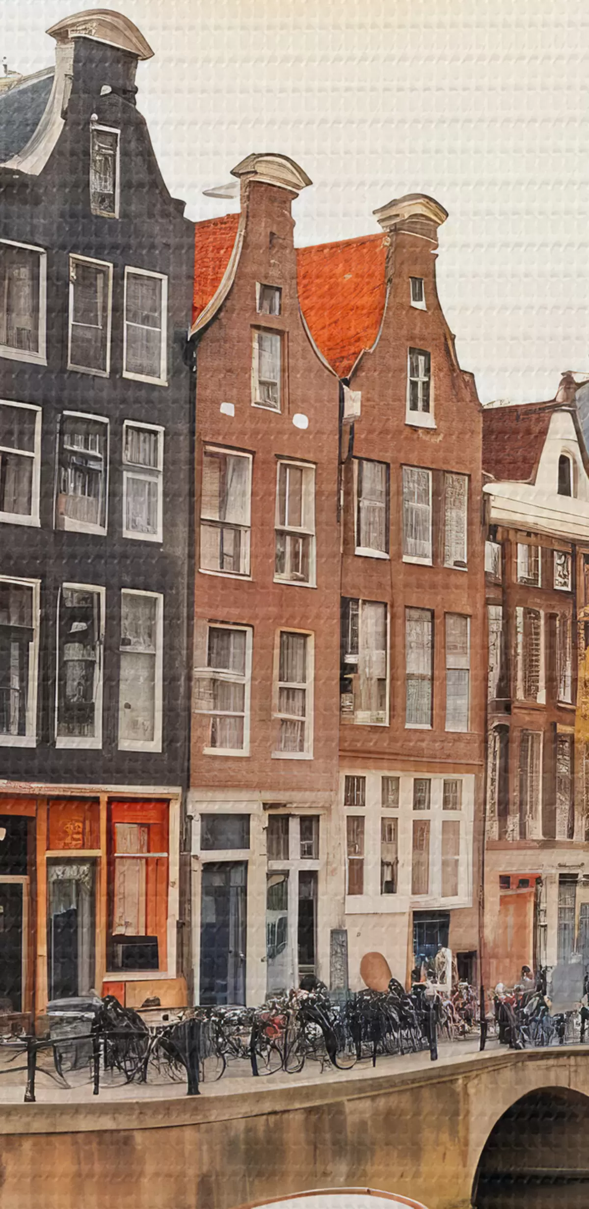 Pictură pe pânză Un peisaj urban în acuarelă colorat din Amsterdam, cu case tradiționale olandeze pe canal și bărci pe apă Nr s40561