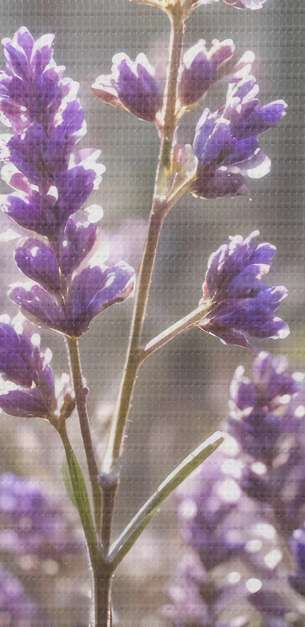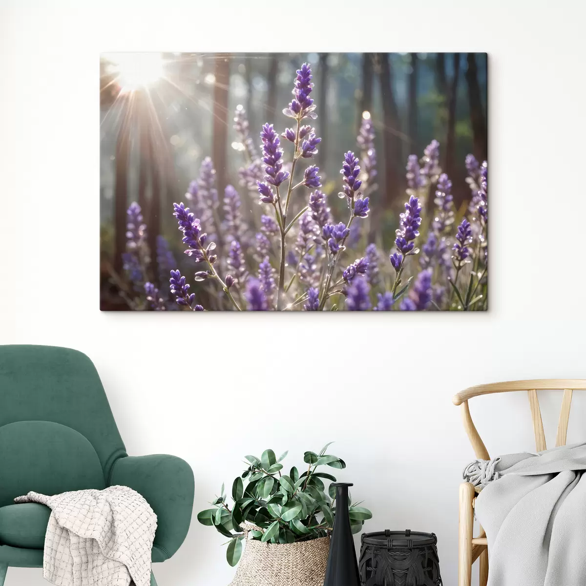 Pictură pe pânză Flori violete de lavandă într-un câmp, cu un fundal de pădure neclar și lumina soarelui care se filtrează Nr s40570