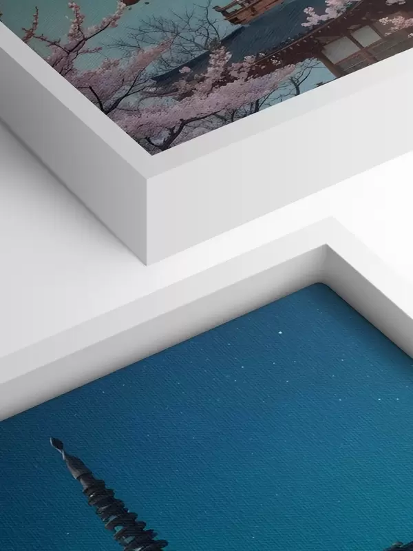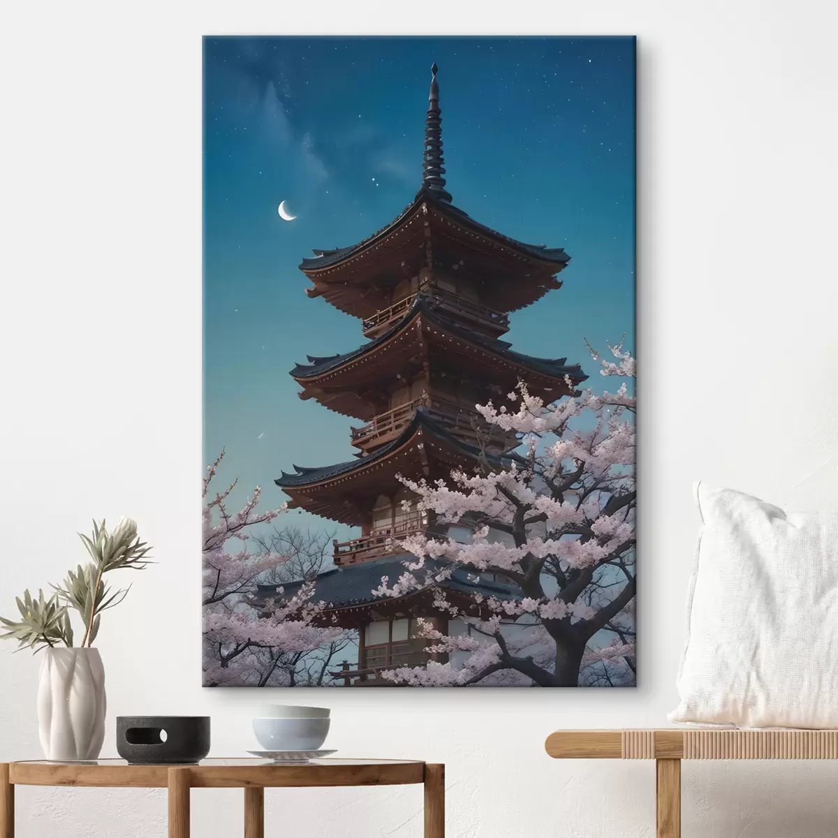 Tablouri O pagodă japoneză tradițională cu o semilună pe cer, cu cireși înfloriți s40586
