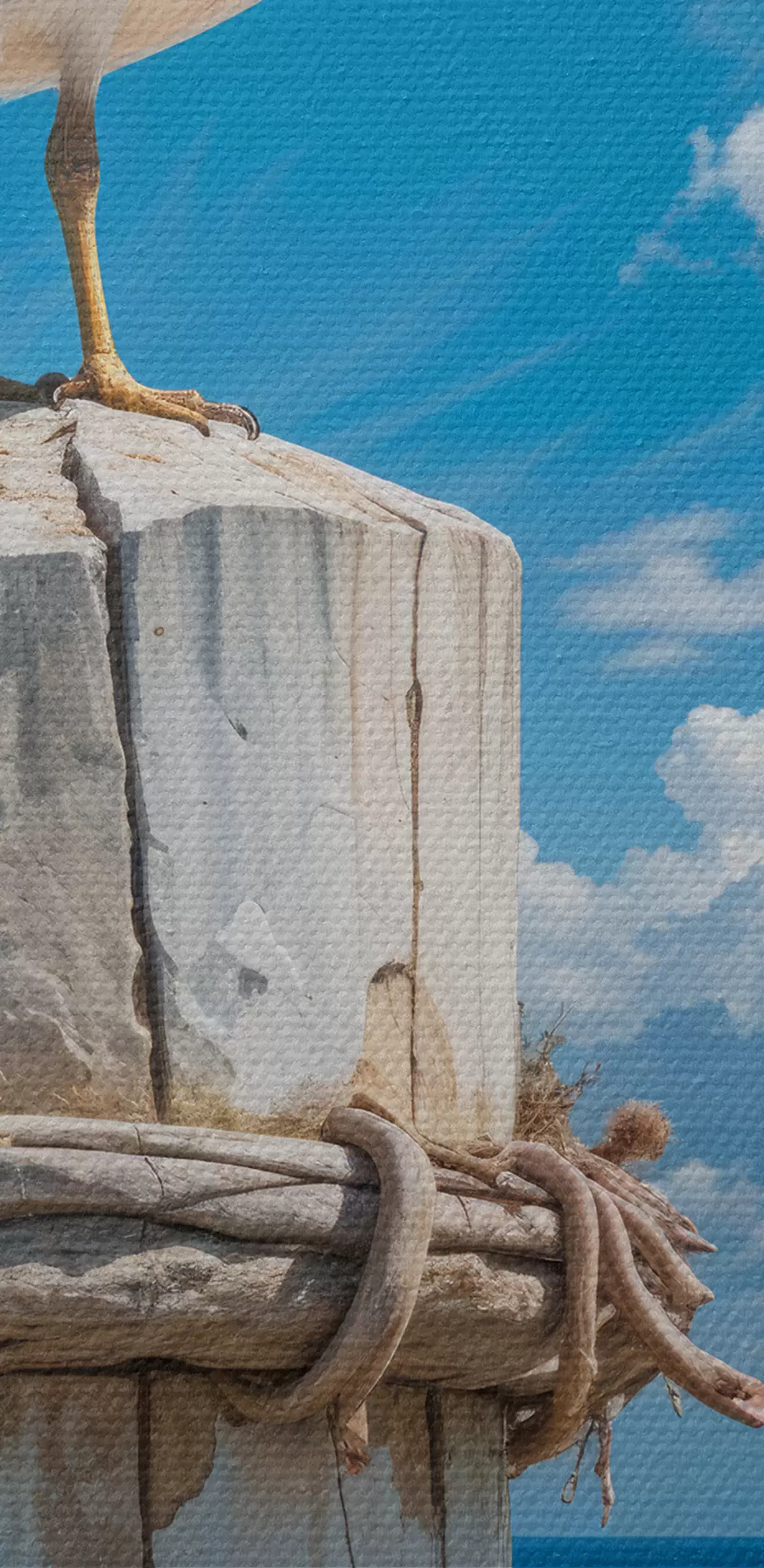 Pictură pe pânză Un pescăruș alb cocoțat pe un stâlp de lemn pe un cer albastru strălucitor și un ocean cu valuri Nr s40590