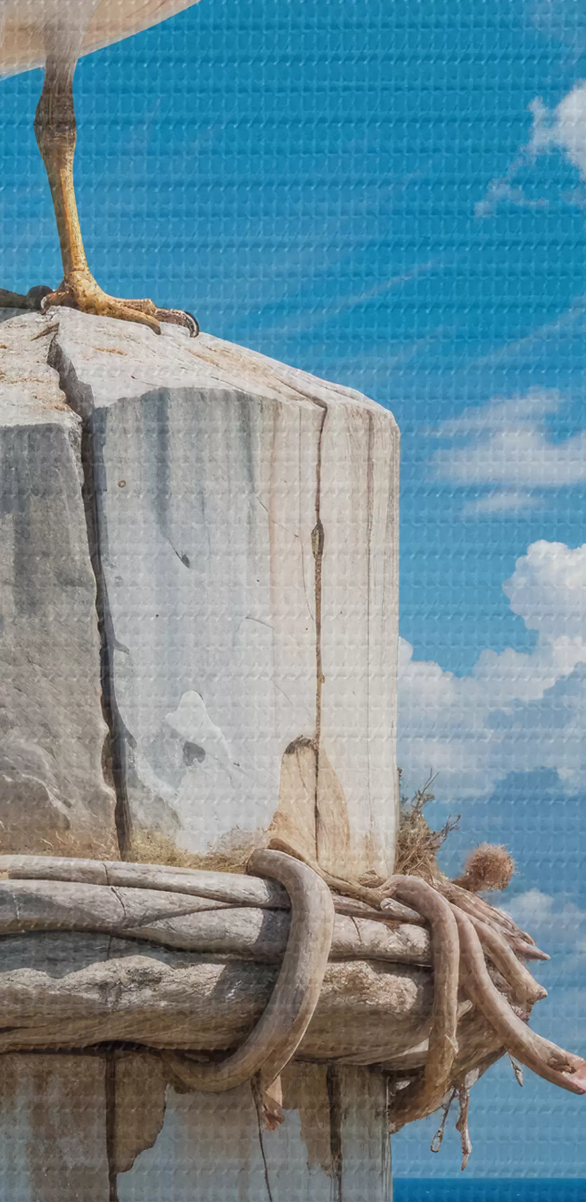 Tablouri Un pescăruș alb cocoțat pe un stâlp de lemn pe un cer albastru strălucitor și un ocean cu valuri  s40590