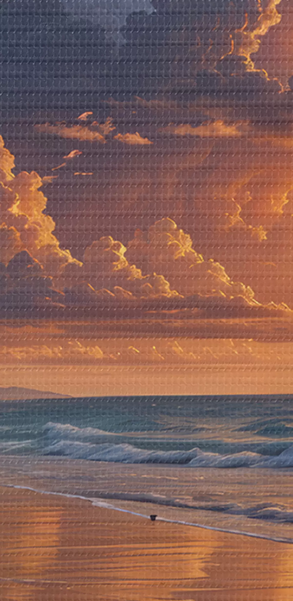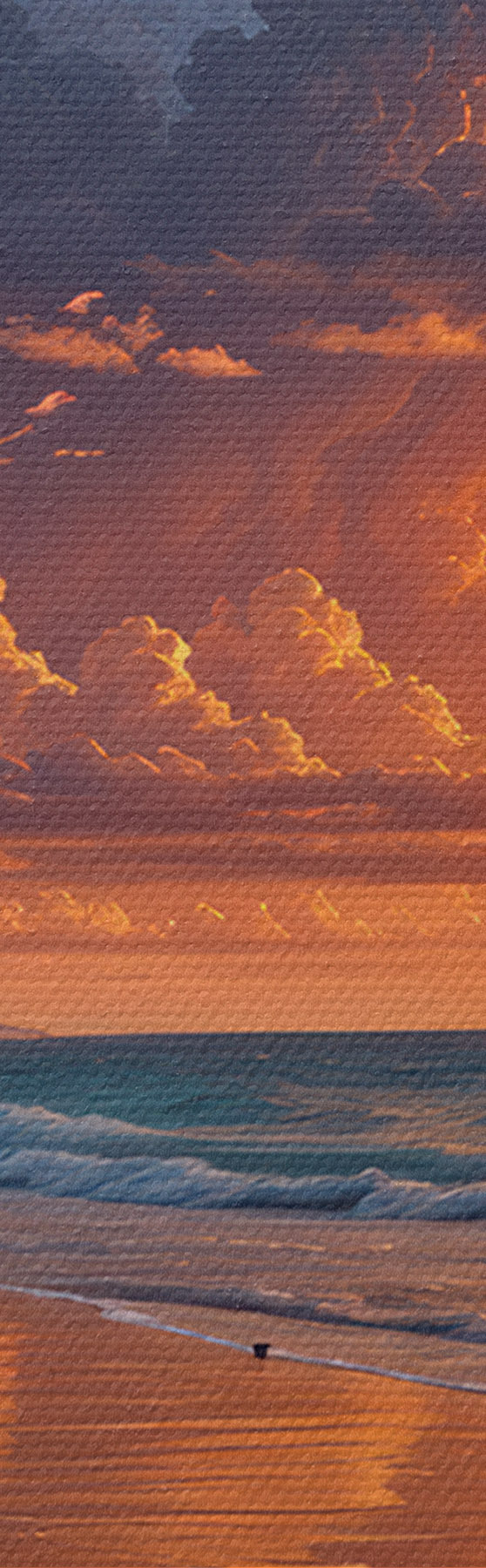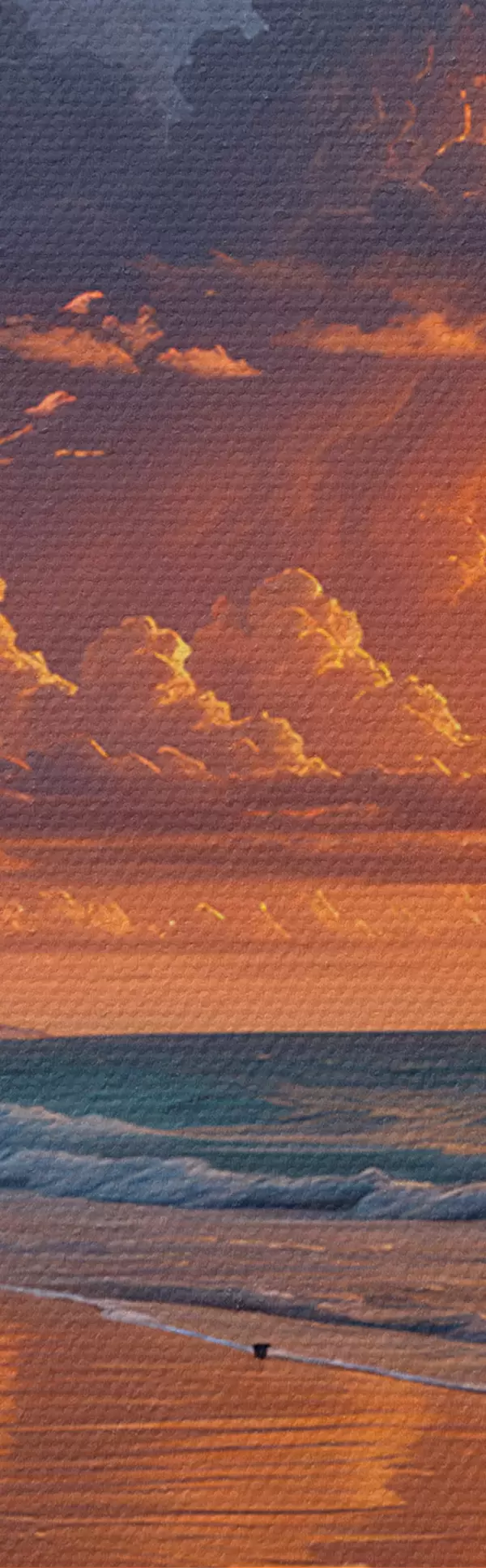Pictură pe pânză Un apus de soare dramatic pe o plajă tropicală, cu nori portocalii și roz vibrante reflectate în apele calme Nr s40599