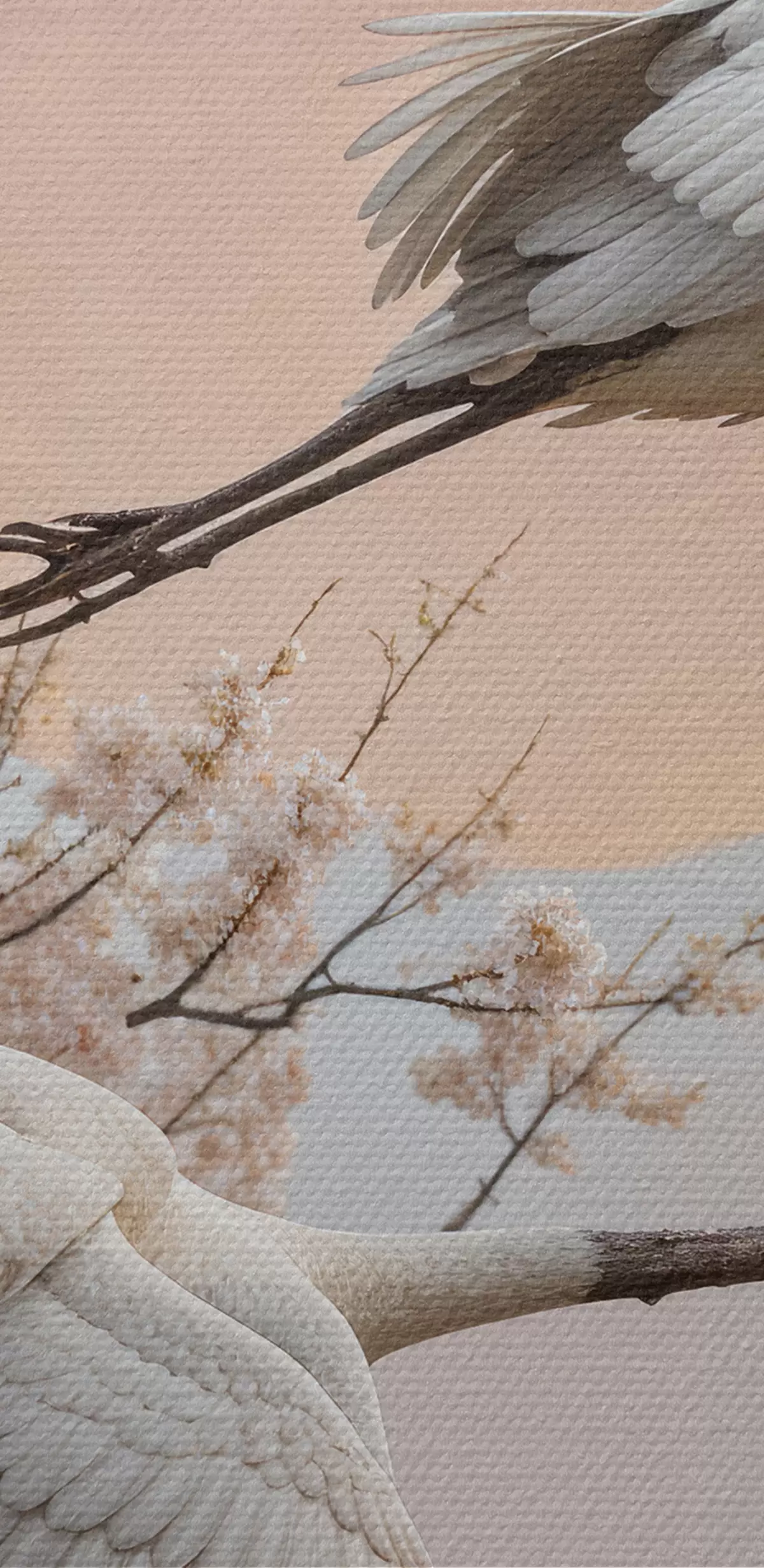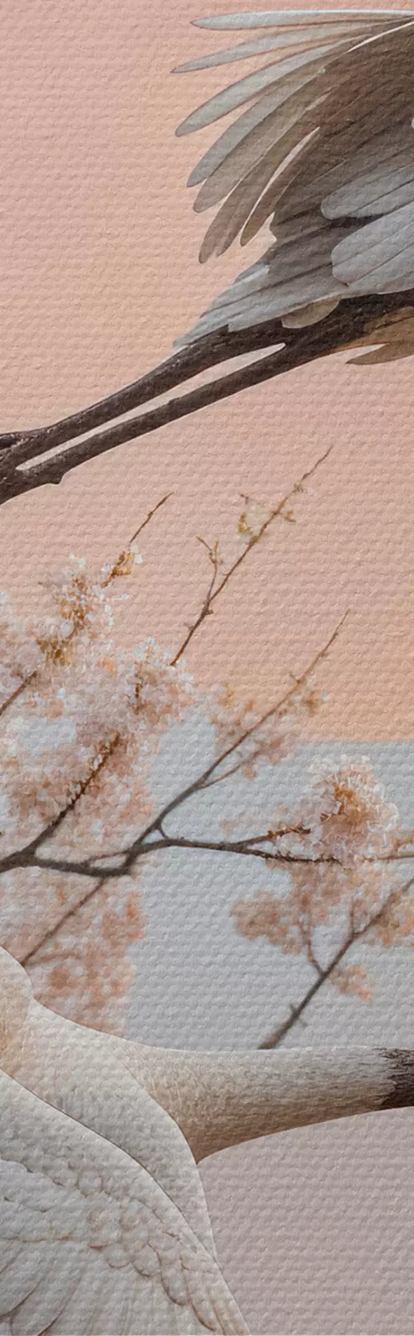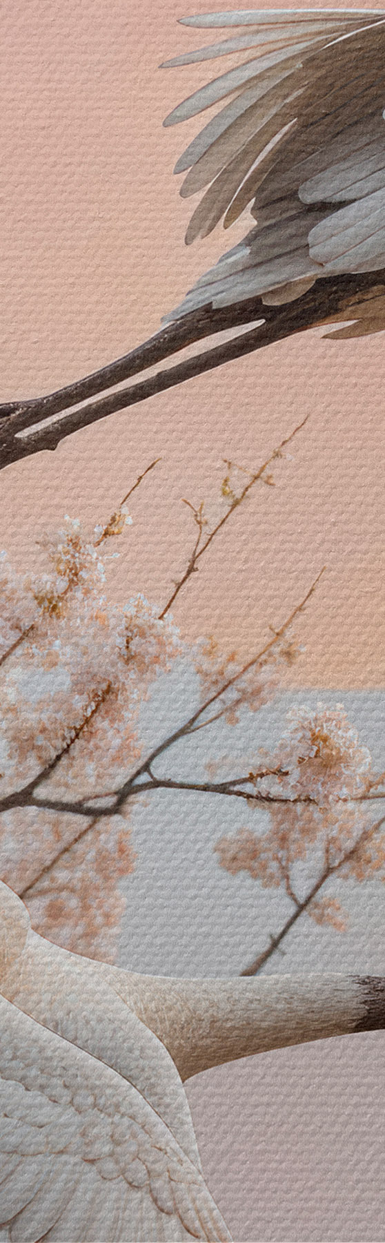 Pictură pe pânză Două cocori albi care zboară printre copacii înfloriți de cireș pe un cer roz la apus Nr s40601