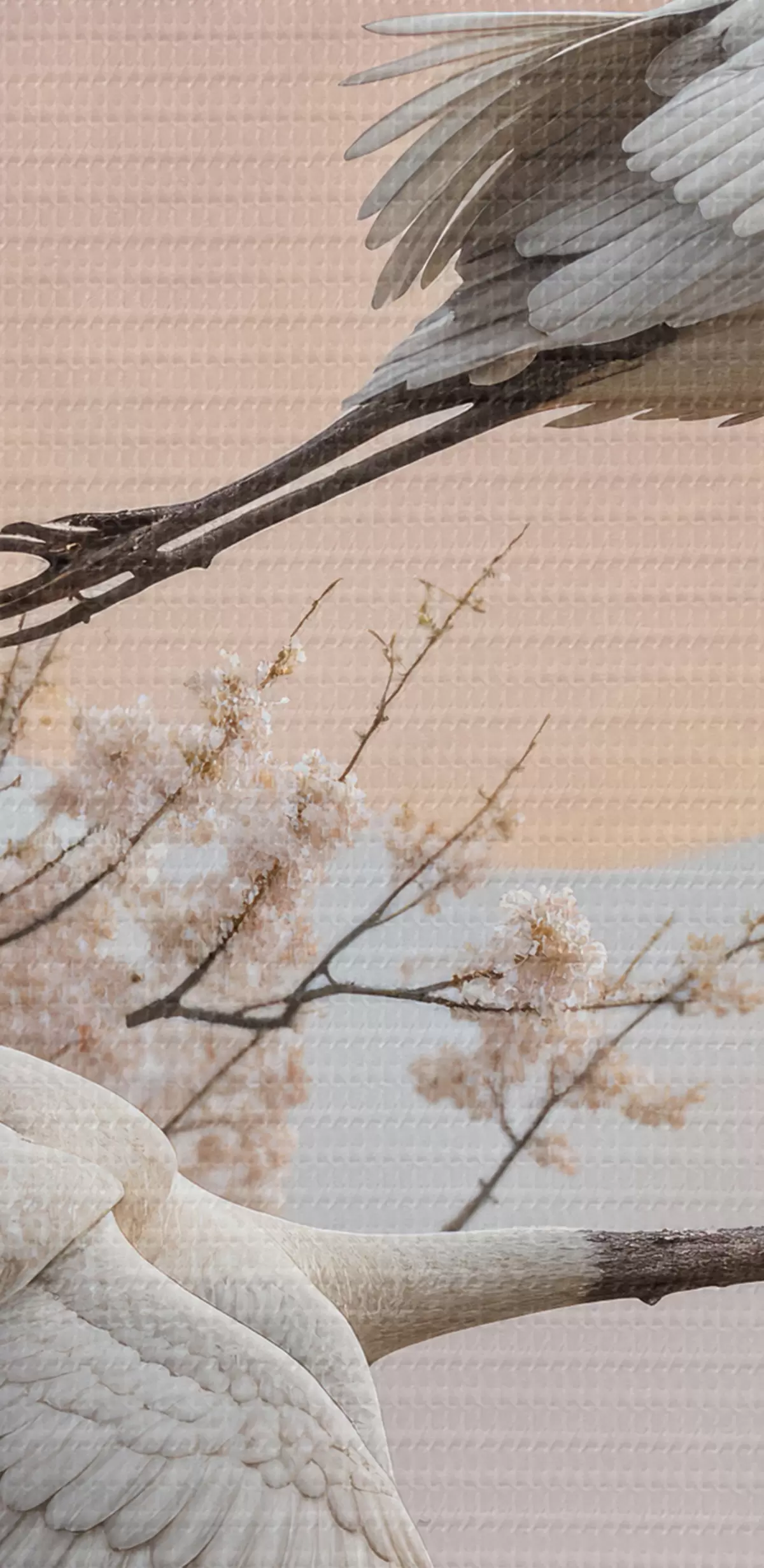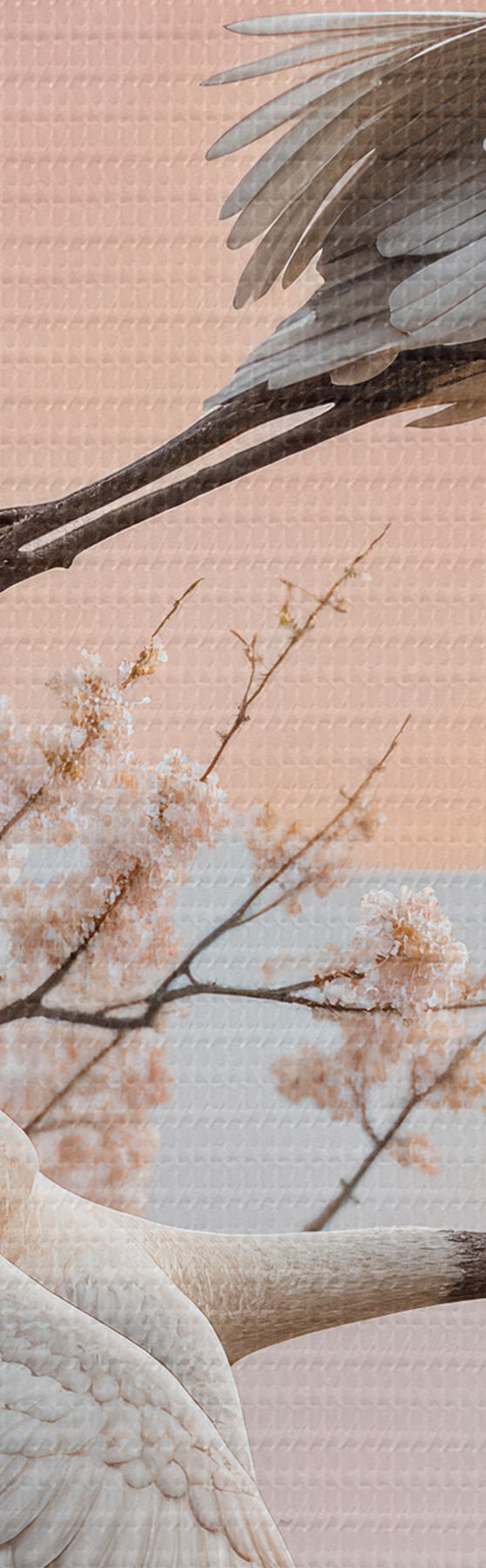 Tablouri Două cocori albi care zboară printre copacii înfloriți de cireș pe un cer roz la apus s40601