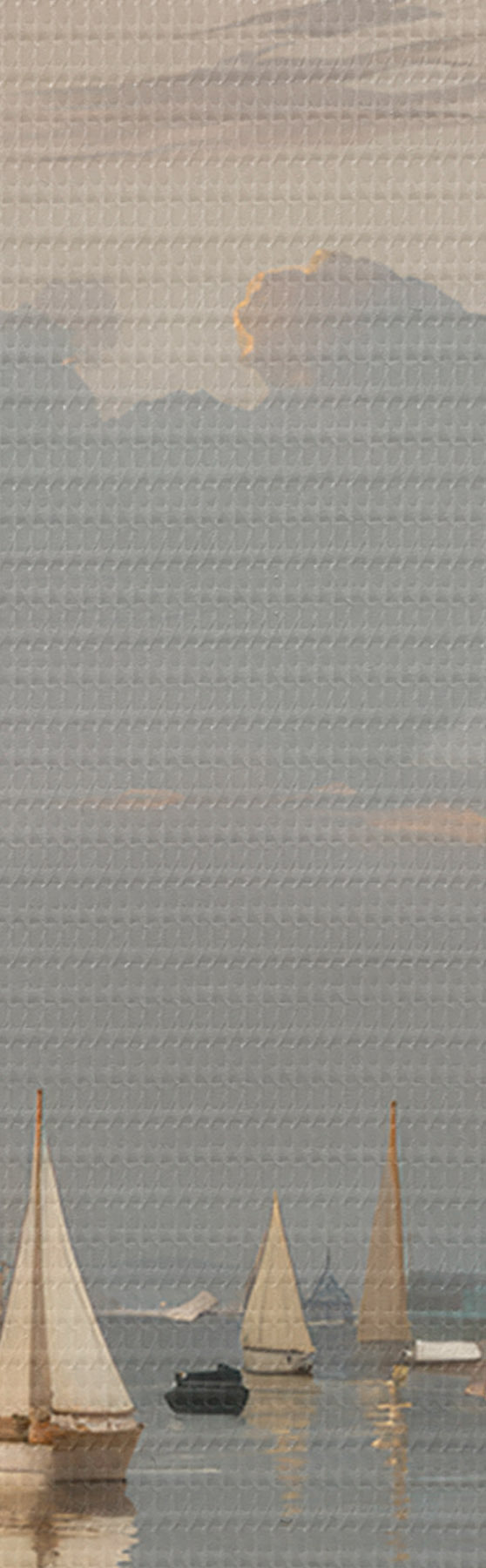 Pictură pe pânză O flotă de bărci cu pânze albe pe un corp de apă calm, reflectorizant, la apus de soare, cu un cer înnorat în fundal Nr s40615