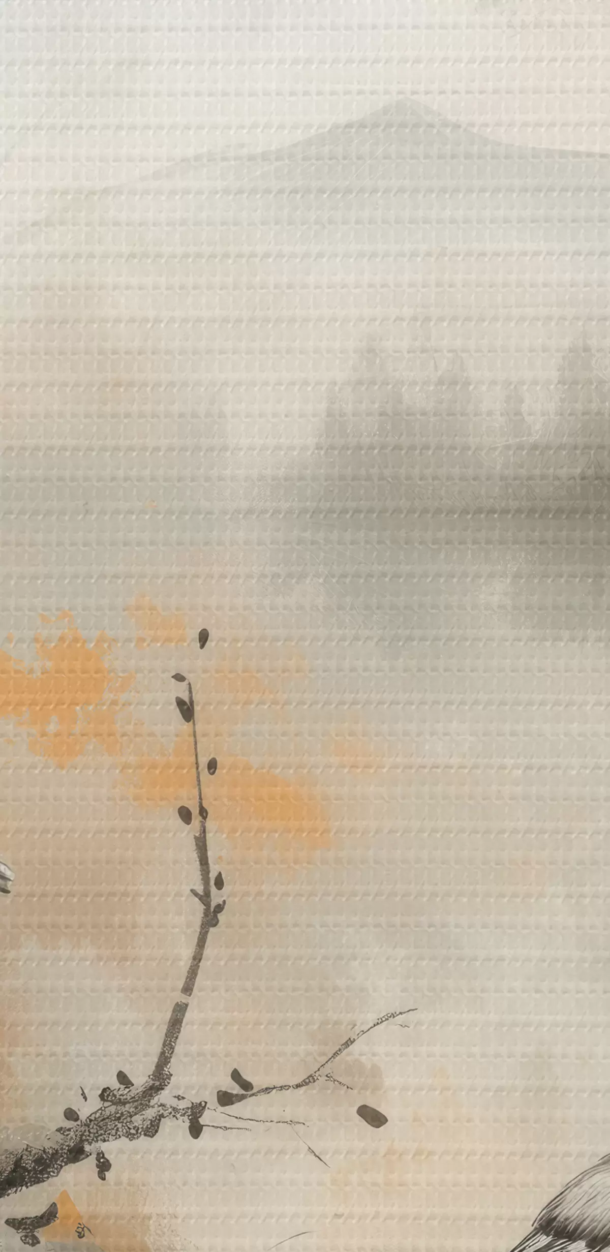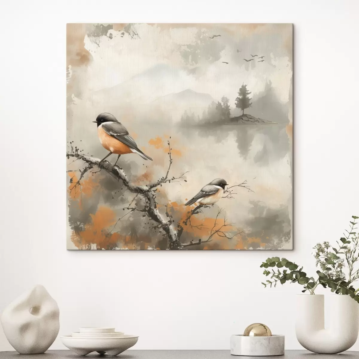 Pictură pe pânză Peisaj acuarelă cu păsări stând pe o ramură în culori pastelate Nr s40655