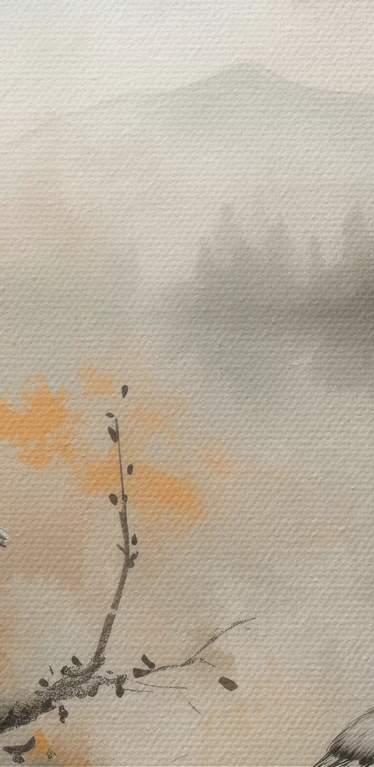 Tablouri Peisaj acuarelă cu păsări stând pe o ramură în culori pastelate s40655