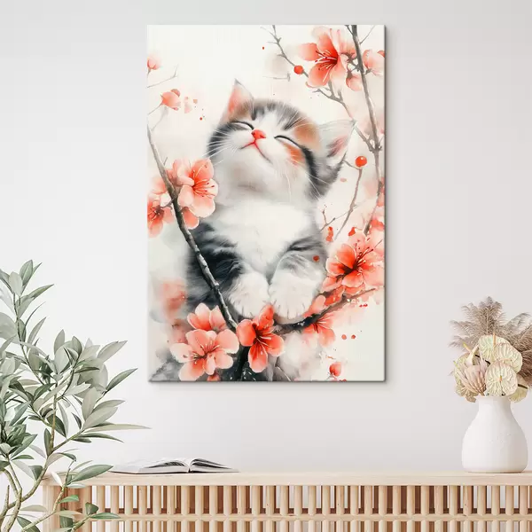 Pictură pe pânză Pisoi drăguț pe o ramură cu flori Nr s40734