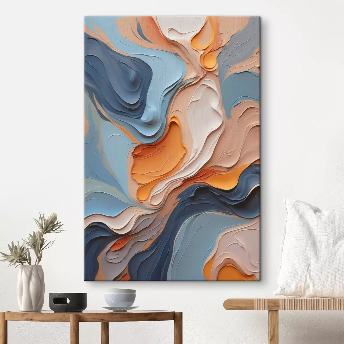 Pictură pe pânză Abstracție în nuanțe de albastru și portocaliu cu textură de imitație Nr s40743