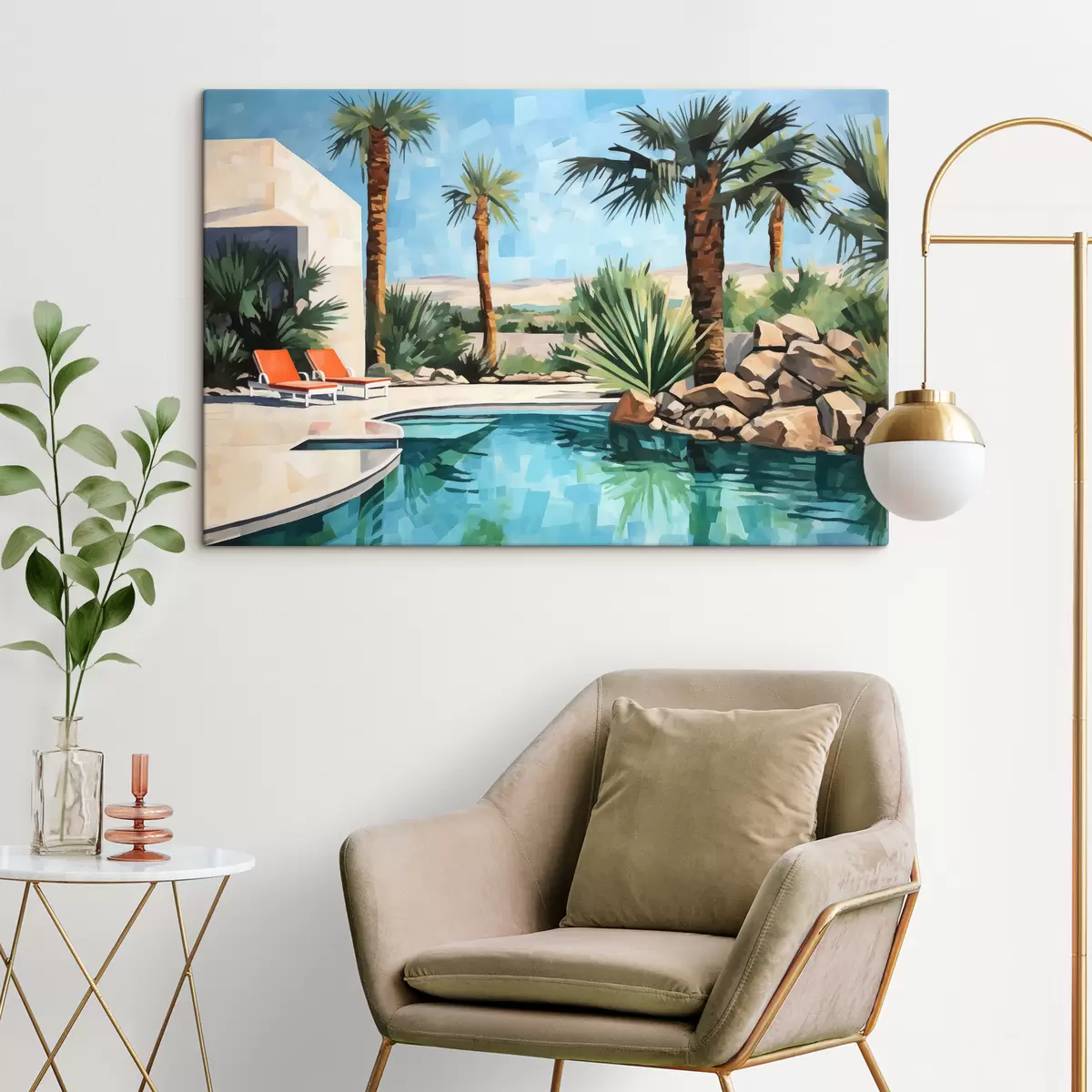Tablouri Palmieri lângă hotel cu o piscină lângă stânci, albastru, verde, roșu culoare s40748